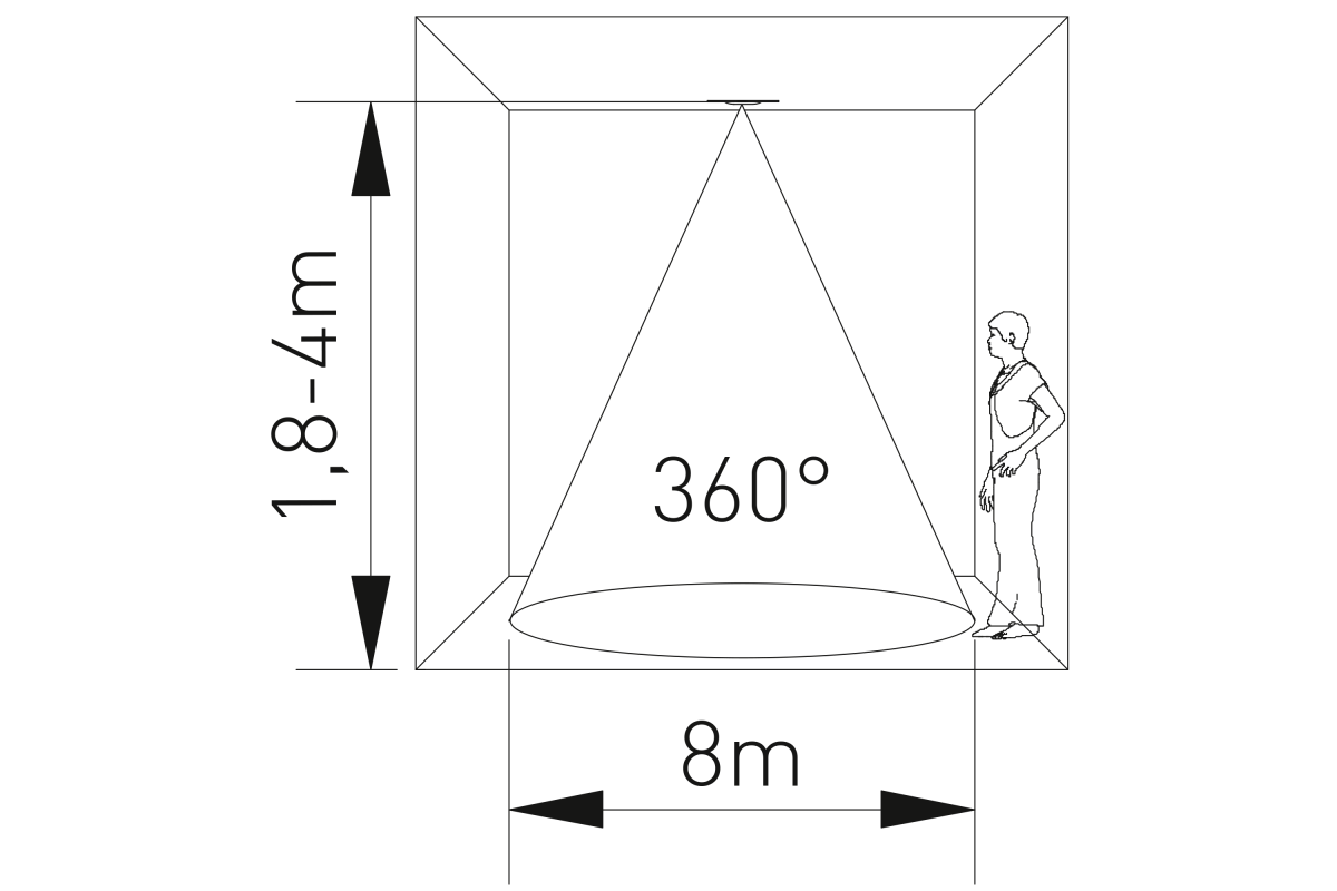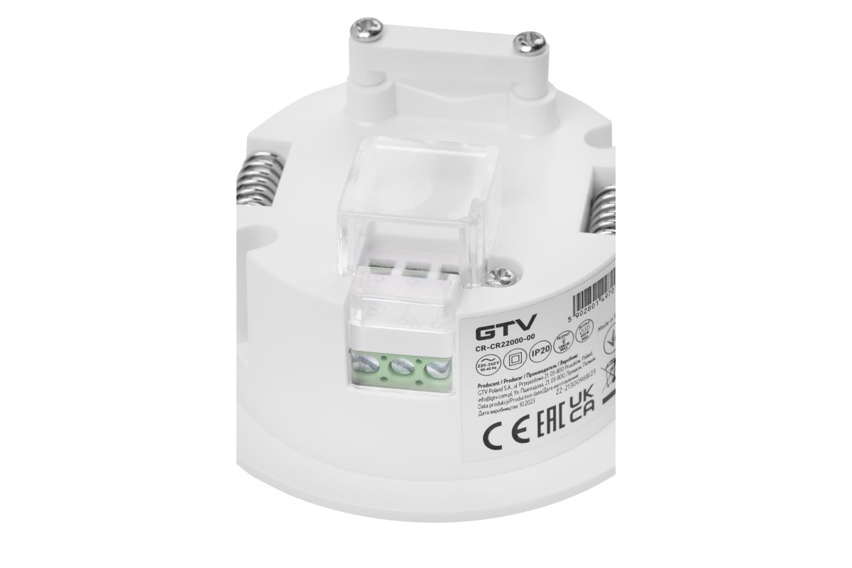Der CR-22 Bewegungsmelder ist ein fortschrittliches, an der Decke montiertes Gerät, das sich dank seines weiten Erfassungswinkels von 360 Grad und seines Erfassungsbereichs von 8 Metern ideal für die Überwachung großer Räume eignet. Durch die einstellbare Backup-Zeit und Tageslichtempfindlichkeit kann der Betrieb des Sensors auf die individuellen Bedürfnisse des Nutzers zugeschnitten werden. Die empfohlene Installationshöhe liegt zwischen 1,8 und 2,5 Metern für eine optimale Effizienz. Der Sensor entspricht der Schutzklasse IP20, was bedeutet, dass er gegen das Eindringen von festen Gegenständen, die größer als 12 mm sind, resistent ist, aber nicht wasserdicht ist. Das Produkt ist für den Betrieb in einem weiten Temperaturbereich von -20 bis +40 Grad Celsius ausgelegt. Die Montageöffnung sollte einen Durchmesser zwischen 63 und 66 mm haben. Es ist die perfekte Lösung für den kommerziellen und privaten Gebrauch. >