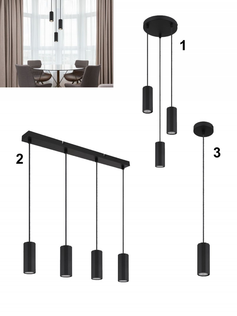 Stilvolle Pendelleuchten aus Metall und Aluminium in Mattschwarz. Der Leuchtenkörper besteht aus Metall und der Schirm aus Aluminium. Mit GU10-Fassung. Diese modernen Leuchten lassen sich mit einem smarten LED-Leuchtmittel ergänzen und per Smartphone die Farbe oder Temperatur des Lichts verändern, dimmen und so eine angenehme Atmosphäre im Innenraum schaffen. |