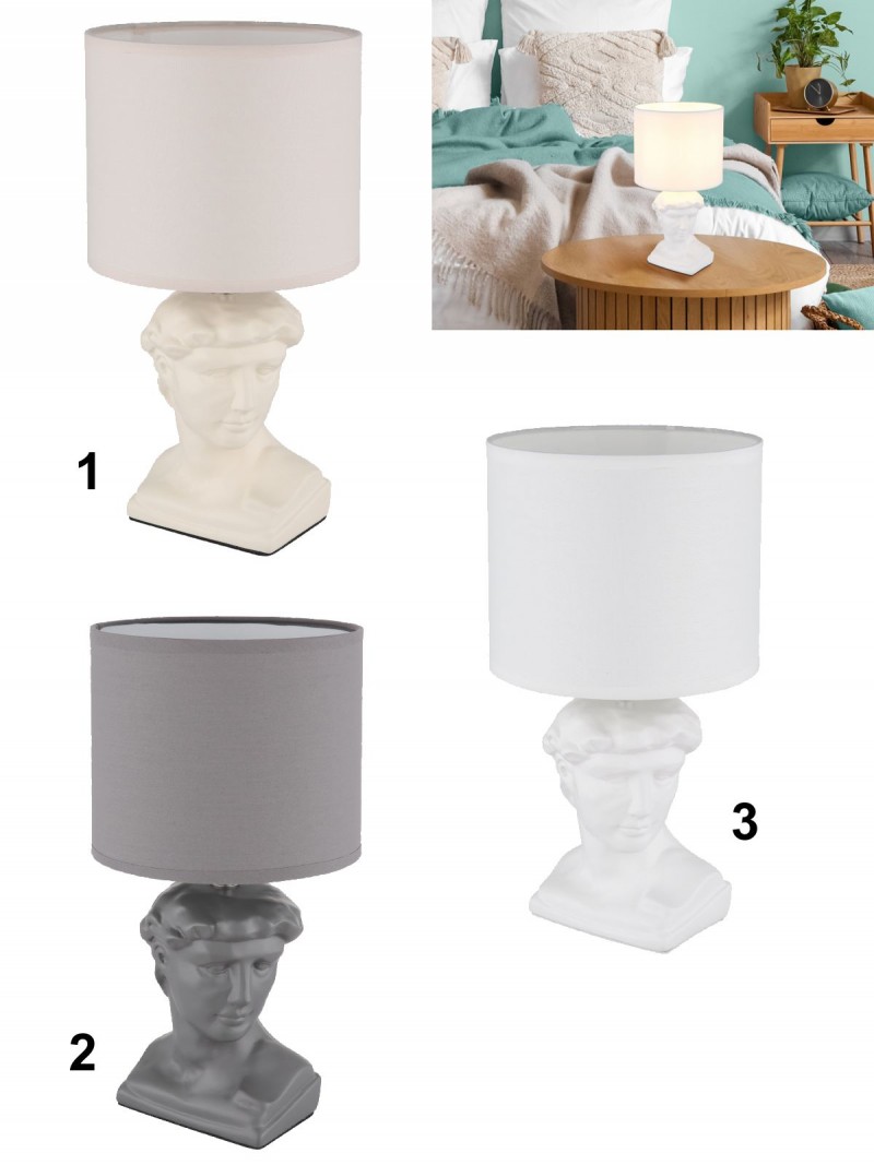 Schlichte, elegante Tischleuchten, geeignet für Wohnzimmer, Schlafzimmer, Flure etc. Der Sockel hat die Form einer Caesar-Büste und besteht aus Keramik, der Schirm ist rund und aus Textil. Mit E14-Fassung. Die Leuchten werden ohne Leuchtmittel geliefert. Kabellänge 130 cm.