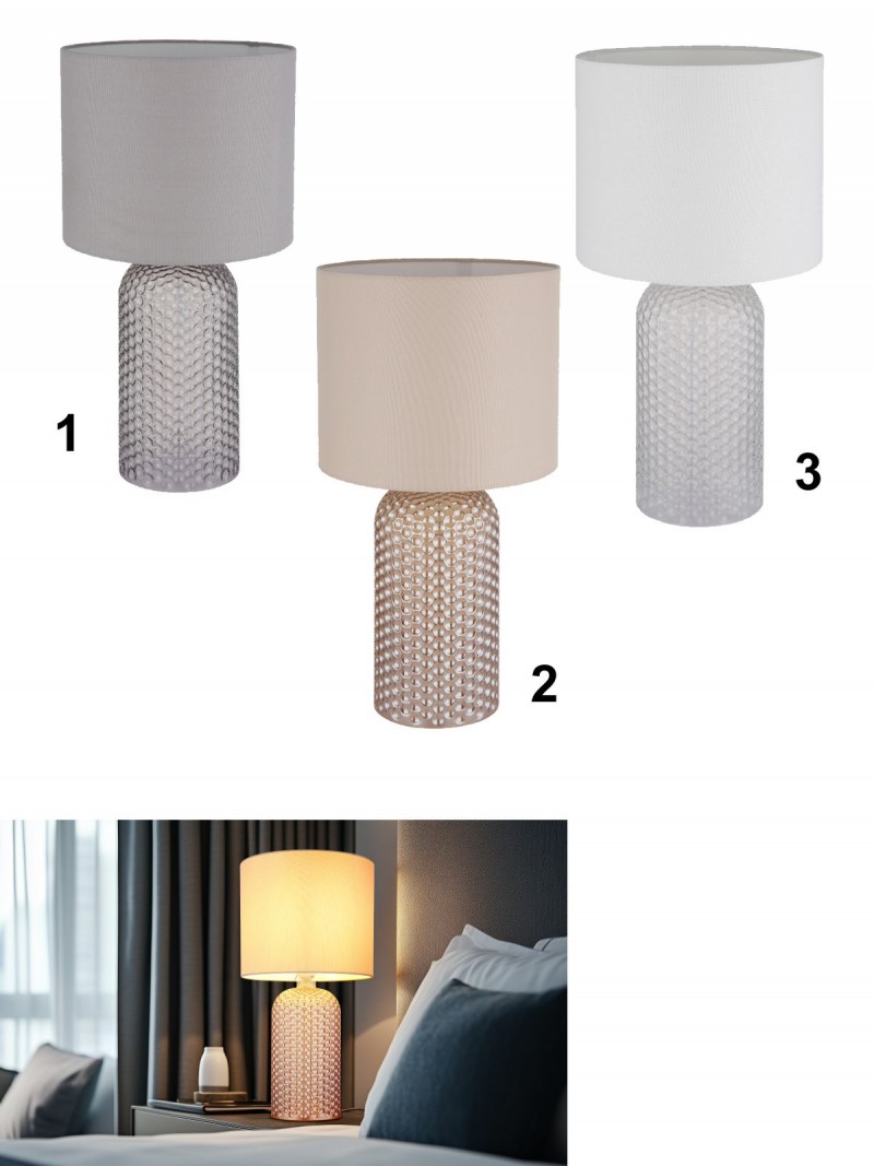 Stilvolle Tischleuchte aus Glas mit Textilschirm. Der Glasfuß der Leuchte ist verziert, was ihr ein interessantes Aussehen verleiht. Sie eignet sich perfekt für Wohnzimmer, Schlafzimmer und Flure, um eine angenehme Atmosphäre zu schaffen. Mit E27-Fassung. Leuchtmittel sind nicht im Lieferumfang enthalten. Kabellänge 130 cm. |