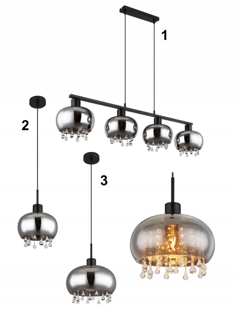 1. GL-15839-4H Závěsné svítidlo, kov černý matný, sklo kouřové, skleněné křišťály průhledné, textilní kabel černý, možnost nastavení výšky, Dx?xV:1140x210x1200mm, bez žárovek 4xE27 LED, Max. 9W 230V detail výrobku
