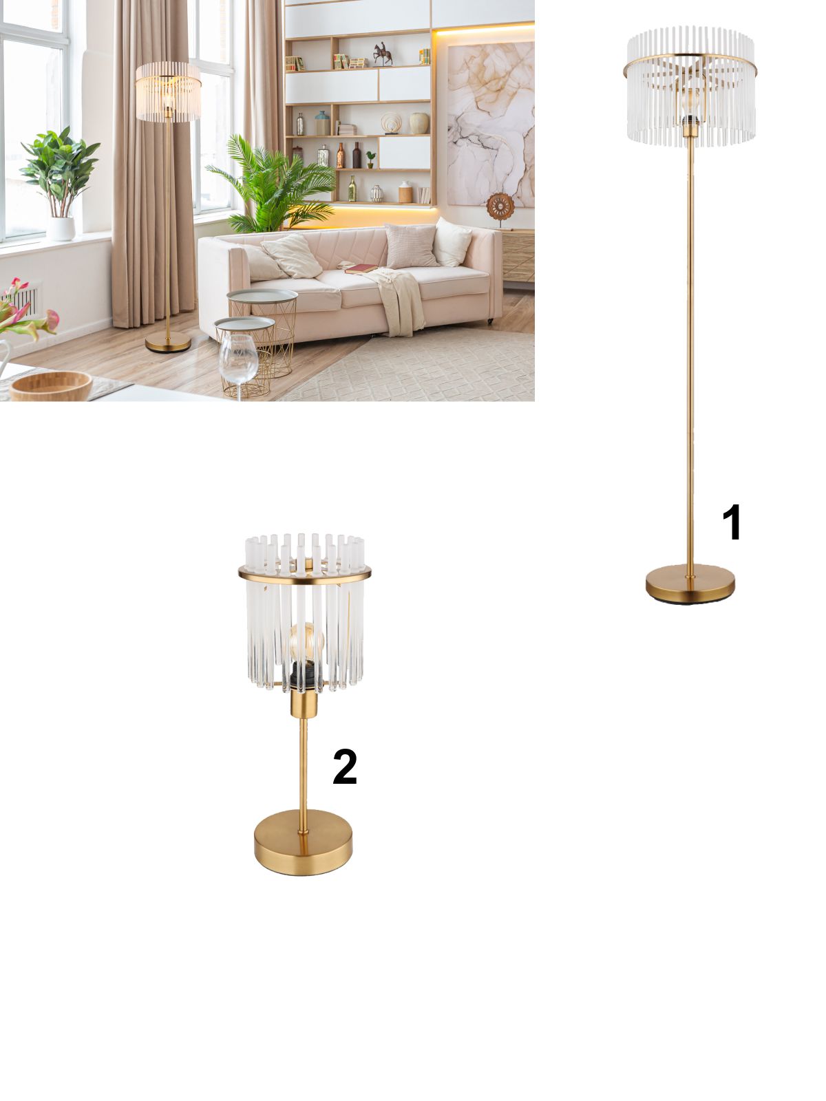 1. GL-15698SM  Stojací svítidlo, kov zlaté barvy, skleněné tyče bílé, průhledné, kabel PVC černý, vypínač na kabelu, ø:380mm, V:1520mm, délka kabelu 1800mm, bez žárovky 1xE27, max. 60W 230V detail výrobku