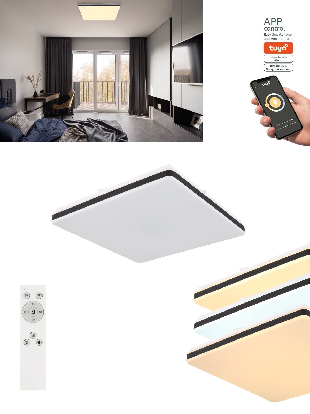 Moderne Deckenleuchte aus Metall und Kunststoff in Mattweiß und Mattschwarz sowie Kunststoff in Weiß. Die Steuerung erfolgt mit einer Fernbedienung oder mit einem Smartphone oder Tablet über Tuya, Alexa oder Google Assistant. Es verfügt über viele nützliche Funktionen wie Nachtlicht, Timer, Speicherfunktion der letzten Einstellung, Änderung der Beleuchtungstemperatur und andere.