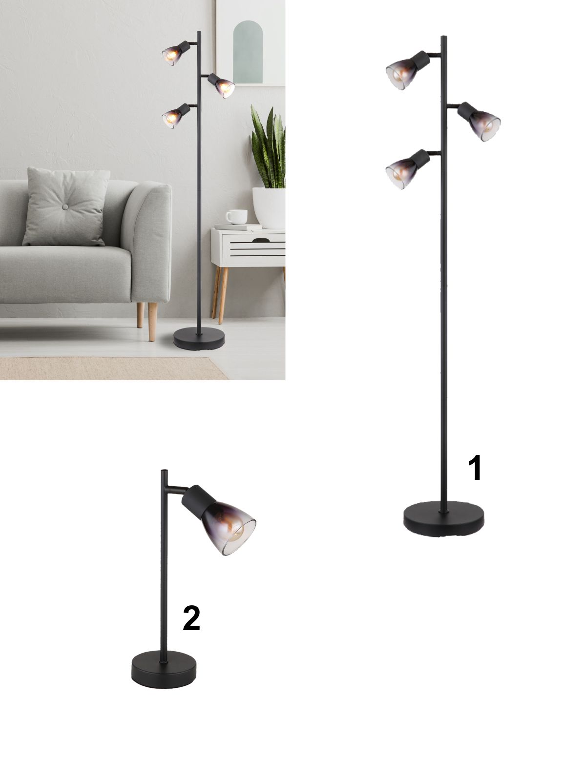 1. GL-54312-3S  Stojací svítidlo, kov černý matný, sklo kouřové a průhledné, kabel PVC černý, vyínač na kabelu, Dx?xV:300x220x1610mm, délka kabelu 1800mm, bez žárovek 3xE14, max. 25W 230V detail výrobku