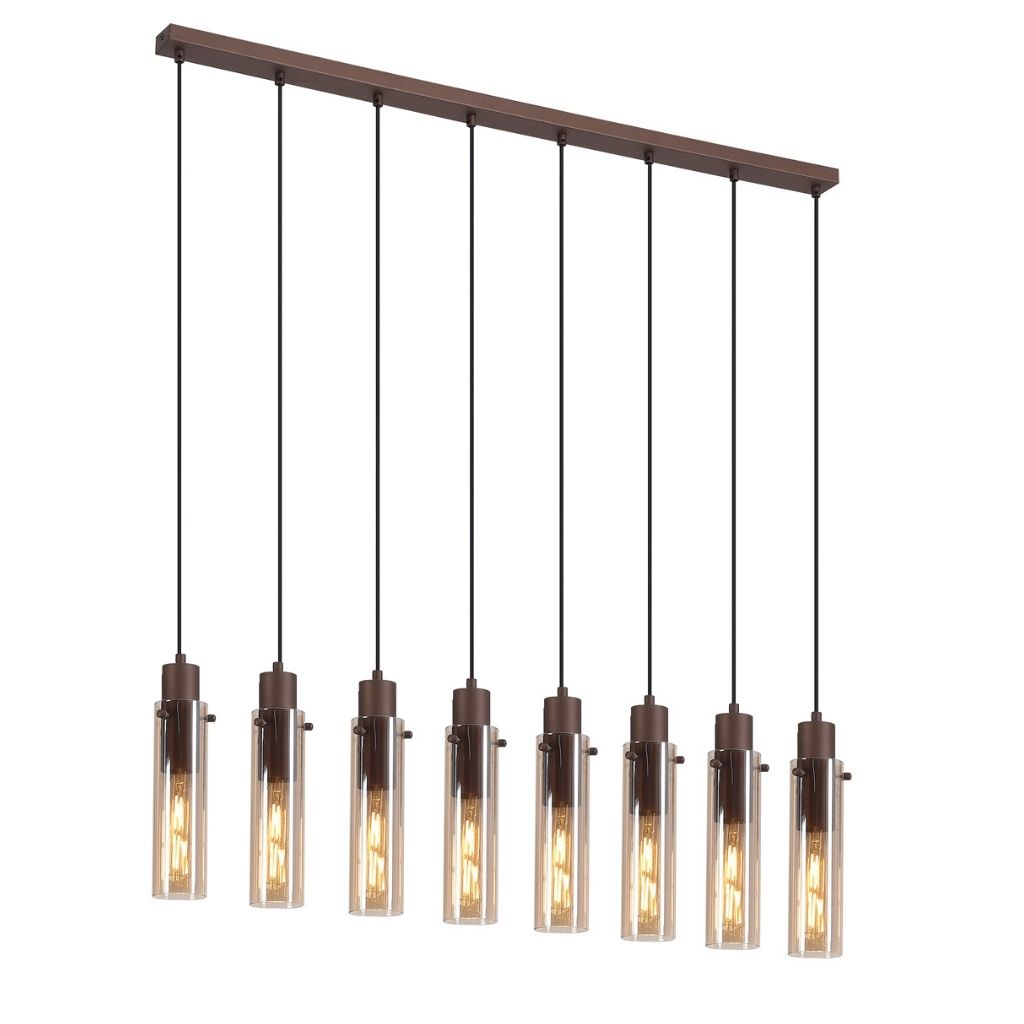 Searchlight Pendelleuchte Kaffee und Bernstein, Oberflächenbehandlung matt pulverbeschichtet, verwendetes Material ist Baustahl und Glas. Maße in cm: Gesamthöhe: 120, Höhe: 32, Breite: 7, Länge: 110, Ausladung: 0. Lichtquelle E27-Fassung, 8 Glühbirnen benötigt, Lichtquelle nicht enthalten, Hersteller empfohlen Glühbirne Typ ist klassische Glühbirne für max 60W.