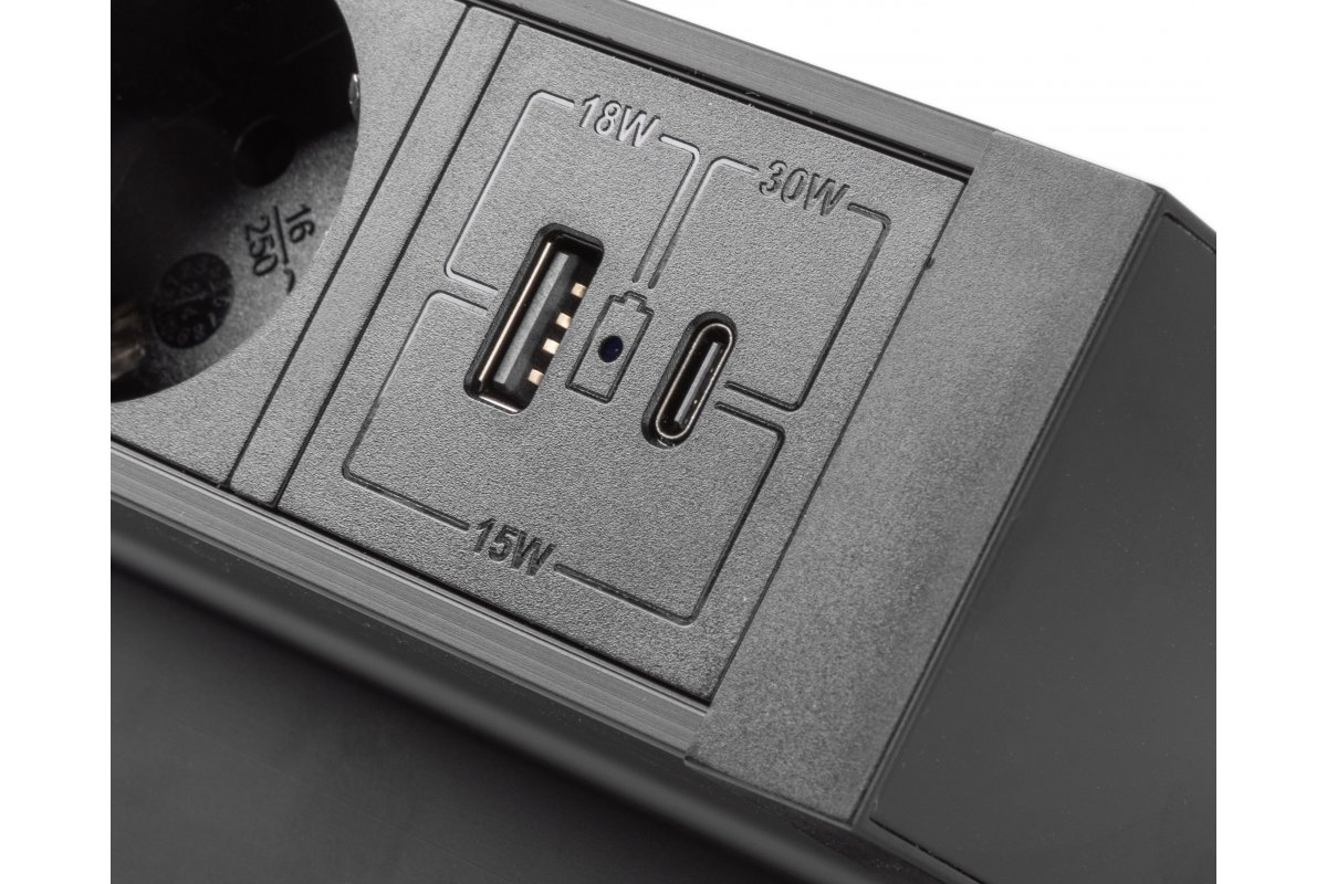 - Má 3x zásuvku schuko a zásuvky USB A + C.