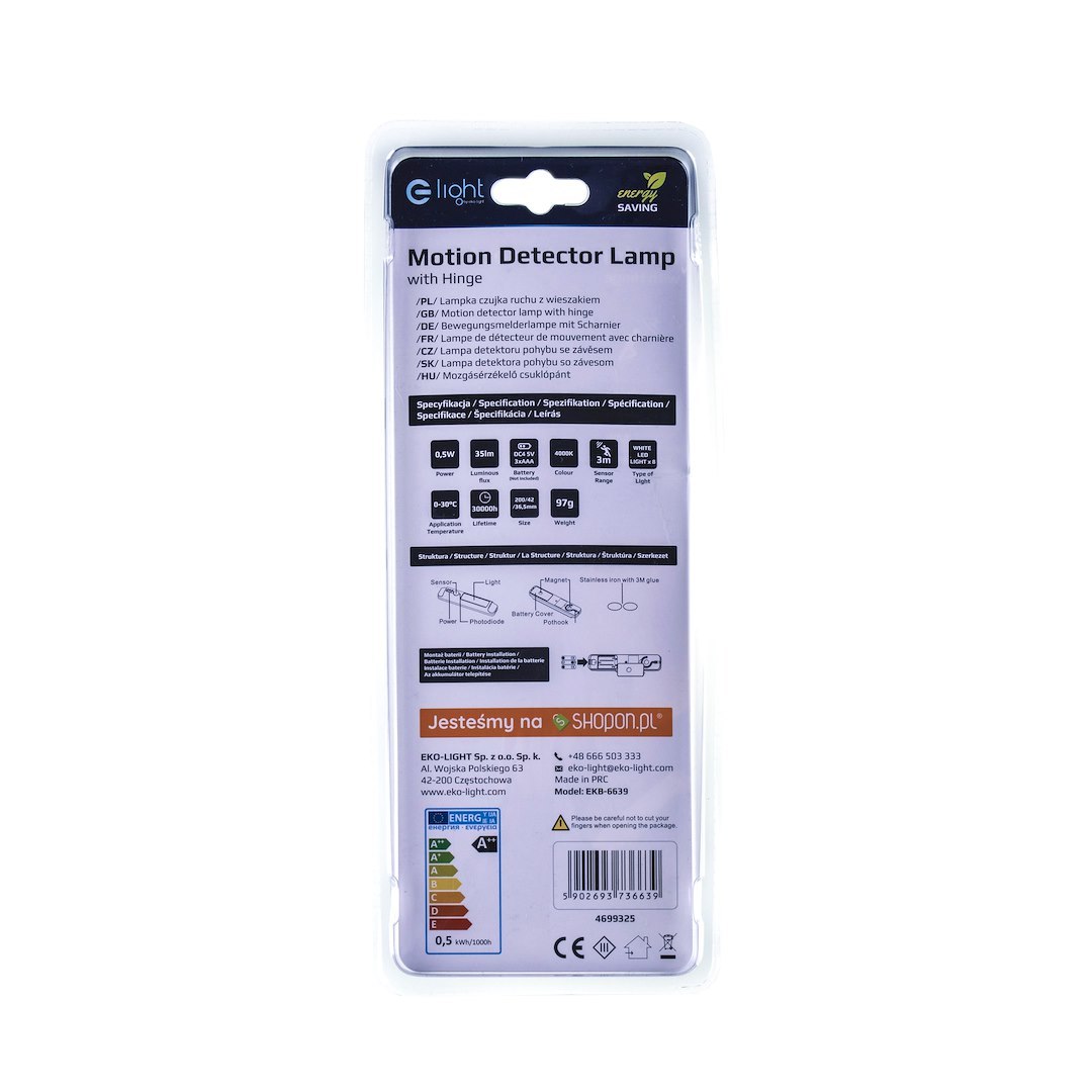 Světlo do skříně se senzorem pohybu a závěsem od společnosti Eko-Light je velmi užitečná pomůcka, která by neměla chybět v žádné domácnosti. Tento model je vyroben z kvalitního PVC materiálu v bílé barvě. Světlo, které lampa vyzařuje, má neutrální barvu, která je 4000 K. Přístroj pracuje s příkonem 0,5 W, přičemž světelný tok činí 35 Im. Za zmínku stojí také stupeň krytí, který je IP 20, což znamená účinnou ochranu proti škodlivým účinkům prachu a pylu. Rozměry tohoto modelu jsou následující: Svítidlo od společnosti Eko-Light je vybaveno světelným zdrojem LED, který se ve srovnání s jinými žárovkami vyznačuje mimořádnou životností. Tento model je napájen z baterií. Má zabudovaný pohybový senzor, který se automaticky rozsvítí, a závěs, takže ji lze zavěsit do skříně na tyč nebo na ramínko. Přístroj je také možné připevnit pomocí oboustranné lepicí pásky s magnetem. |
