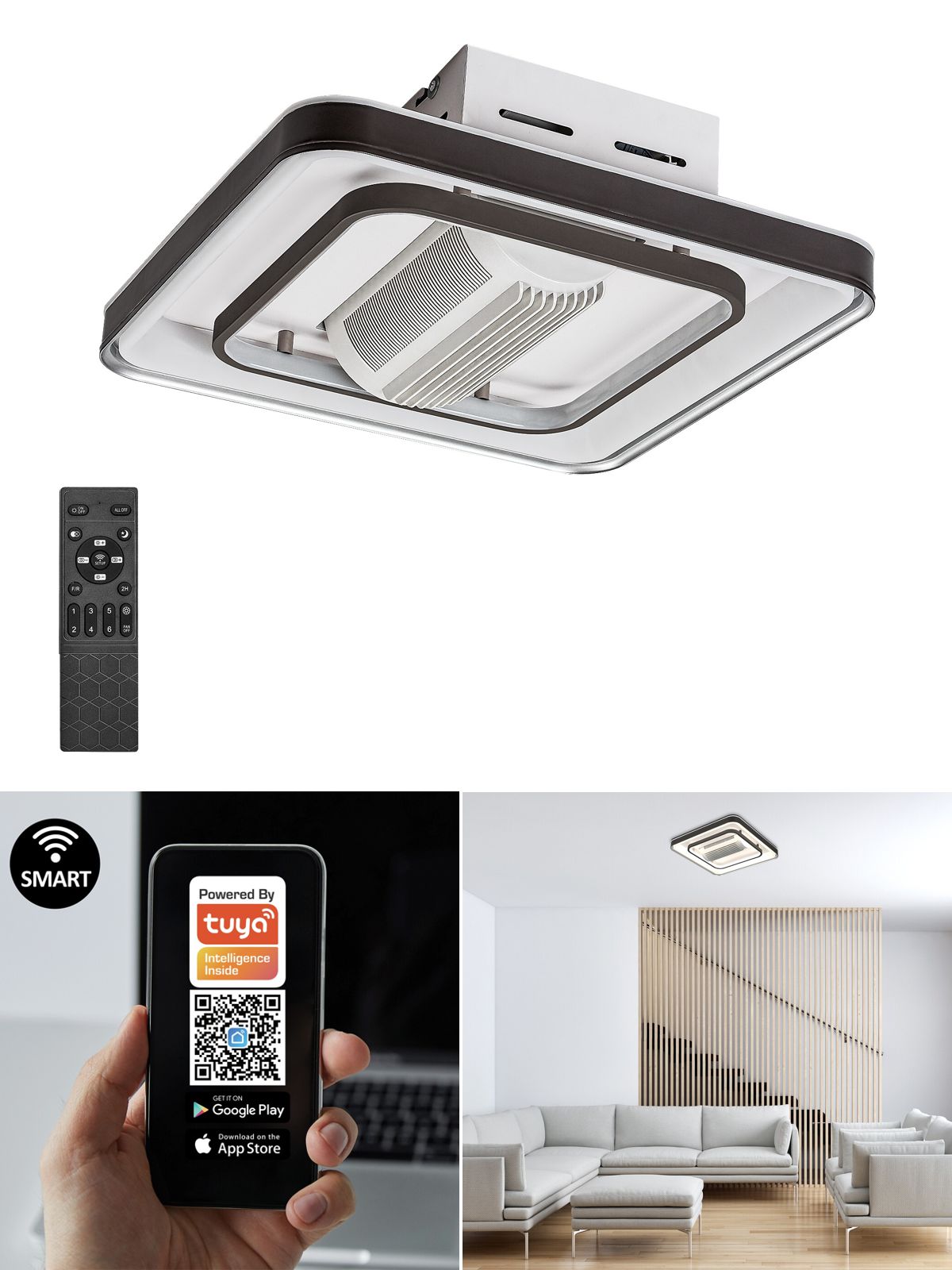 Eine moderne und praktische Leuchte im Ventilator verfügt über ein integriertes LED-Leuchtmittel, das für einen energieeffizienten Betrieb und eine lange Lebensdauer sorgt. Die Lampe wird mit einer Fernbedienung geliefert und kann auch per WLAN über ein Smartphone oder Tablet gesteuert werden. Es verfügt über viele Funktionen wie Dimmen, Speicherfunktion für die letzte Einstellung, Timer, Nachtlicht und andere. Die Lampe besteht aus Metall und Acryl in einer Kombination aus Schwarz und Weiß. Die Lüftergeschwindigkeit ist einstellbar und seine Leistung reicht für einen 12 m² großen Raum.