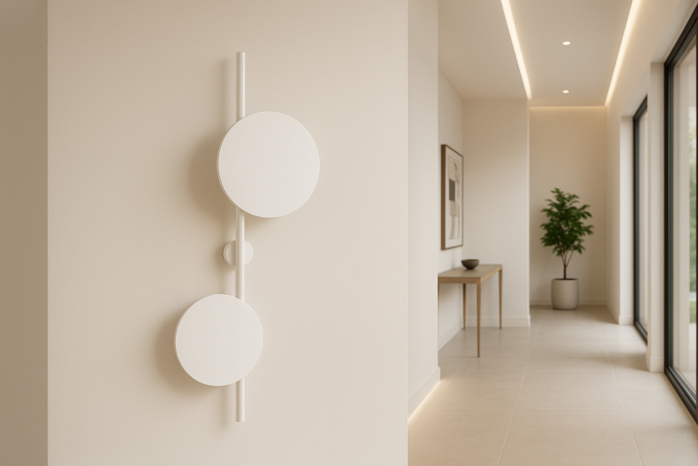 Pozice pro minimalismusSérie lamp PERO v sobě spojuje minimalistický design, estetiku a nadčasové barvy. Kruhové bílé disky jsou ústředním prvkem, kolem kterého byla navržena celá série nástěnných svítidel. Kolekce PERO je sesterskou řadou řady REGI, která zahrnuje nástěnná svítidla v černé barvě. Zahrnuje plochá nástěnná svítidla dostupná ve třech velikostech a složitější modely, které kombinují jednoduchou trubici s kulatými kryty světelných zdrojů. Svítidla lze kombinovat pomocí speciálních konektorů a vytvářet tak moderní kompozice. Funkční a moderní svítidlaTato designová nástěnná svítidla jsou nejen funkčními světelnými body, ale také modernistickými dekoracemi, které doplňují loftový, industriální nebo minimalistický interiér. Měkké světlo vycházející zpoza ciferníků dodá místnosti netradiční nádech. Co je dnes v osvětlení trendy? - Rozhodně asymetrie!Použití asymetrie dodává svítidlům PERO moderní nádech. Na rovné trubici jsou připevněny dva bílé disky různých průměrů, které vytvářejí nejen světelný zdroj, ale také jedinečnou dekoraci. Oboustranné světlo jemně vykukuje zpoza kovových disků a dodává interiéru stylový nádech. Svítidlo můžete namontovat jak vertikálně, tak horizontálně. Můžete také kombinovat různé modely z řady PERO a vytvořit tak jedinečné uspořádání na celé stěně. Kupte si úhlový konektor a vytvářejte neobvyklé kompozice!Svítidla lze připojit pomocí našeho bílého konektoru, který máme v nabídce. Pomocí něj můžete vytvořit individuální kompozici. Úhlový konektor umožňuje kolmo propojit svítidla se třemi, dvěma nebo jedním světelným zdrojem, umístěným na trubce. Průměr průřezu je 16 mm a je samozřejmě dokonale přizpůsoben trubkám ve svítidlech. Vše je vyrobeno ze špičkového materiálu, který vydrží dlouhá léta. Snadná kombinace s ostatními nástěnnými svícny z této řadyMontáž a kombinace nástěnných svícnů z řady PERO je velmi snadná a intuitivní - zvládne ji každý bez specializovaného nářadí.