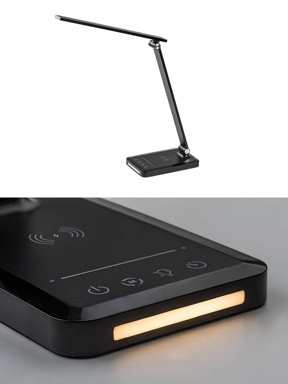 Diese moderne LED-Tischleuchte verfügt über zahlreiche weitere Funktionen, die über einen Touch-Schalter gesteuert werden, wie Helligkeit, Farbtemperatur, Memory, Timer und Nachtfunktion. Sie verfügt außerdem über einen integrierten USB-Anschluss, über den ein Mobiltelefon aufgeladen werden kann. Für einige Telefone ermöglicht die Leuchte auch kabelloses Laden. Geeignet für Büros, Arbeitszimmer und Kinder- bzw. Studentenzimmer.