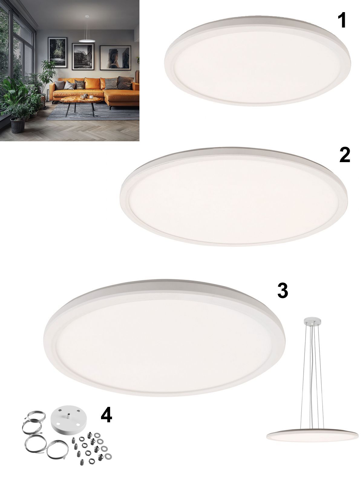 Moderne runde Leuchte aus Kunststoff in Weiß. Dank des Schalters lässt sich die Lichttemperatur auf 3000K/4000K oder 6000K einstellen. Sie verfügt über die Schutzart IP54 und ist somit auch für den Außenbereich geeignet. Die Leuchte unter Nummer 2 und 3 lässt sich durch den Kauf einer Pendelleuchte zu einer eleganten Hängeleuchte umgestalten. |