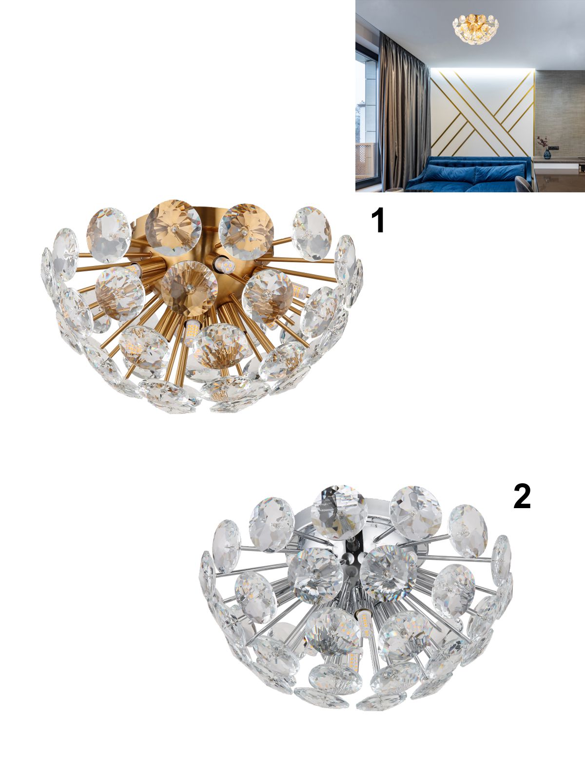 Moderne Kristall-Deckenleuchten. Der Sockel ist aus Metall, der Schirm besteht aus runden, klaren Kristallen auf Metallstäben. K9-Kristall. Es werden ausschließlich LED-Lampen empfohlen. Die Leuchte wirkt sehr elegant. Im eingeschalteten Zustand reflektiert das Licht im Kristall und wirkt luxuriös.