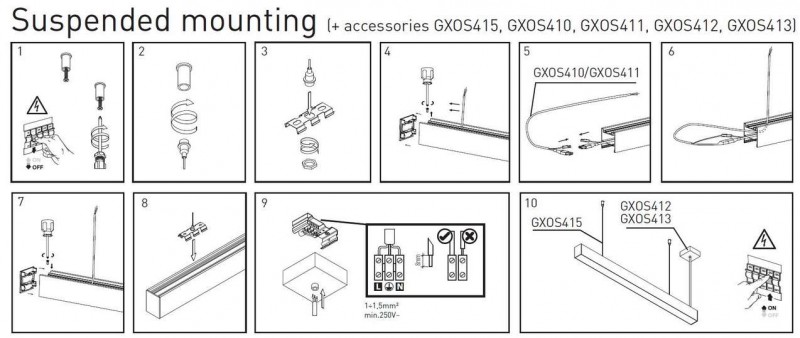 Svítidlo LINIK má vyvedený pouze 25 cm dlouhý přívodní kabel. Pro odsazenou závěsnou montáž může být zapotřebí dokoupit 1,6 m dlouhý přívodní kabel s konektorovým zakončením. (GXOS410)