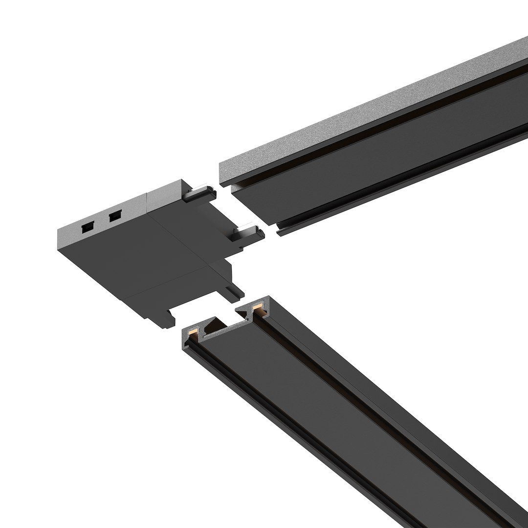 Černý kolejnicový konektor ve tvaru písmene L umožňuje změnit směr instalace o 90°. Je obzvláště užitečný v rohových prostorech, kde světlo musí kopírovat uspořádání místnosti. Jeho robustní konstrukce a plná kompatibilita se systémem zaručují spolehlivé používání.