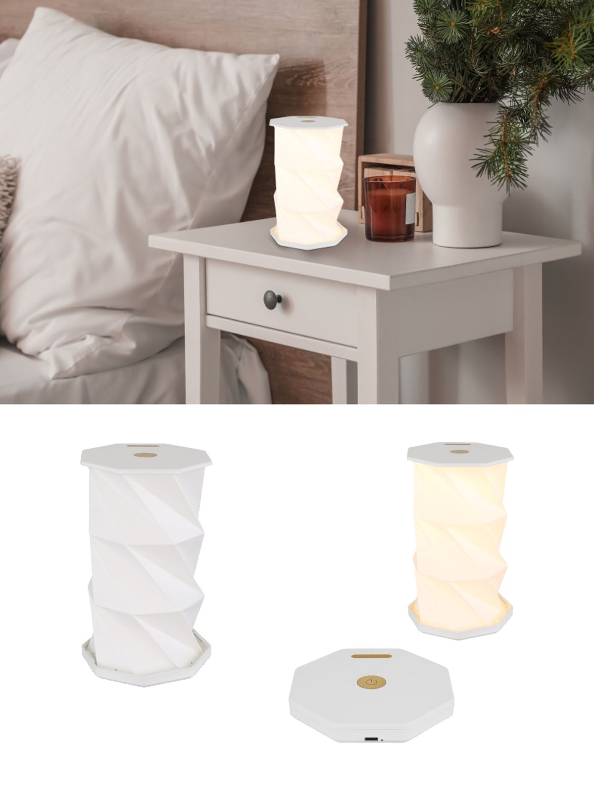 Achteckige Lampe aus Kunststoff. Sie verfügt über Lichtsteuerung, Touch-Ein/Aus, Dimmen und Lichttemperatureinstellung auf 3500K/4800K/2600K. Bendera ist eine ideale Ergänzung für jedes moderne Interieur. |