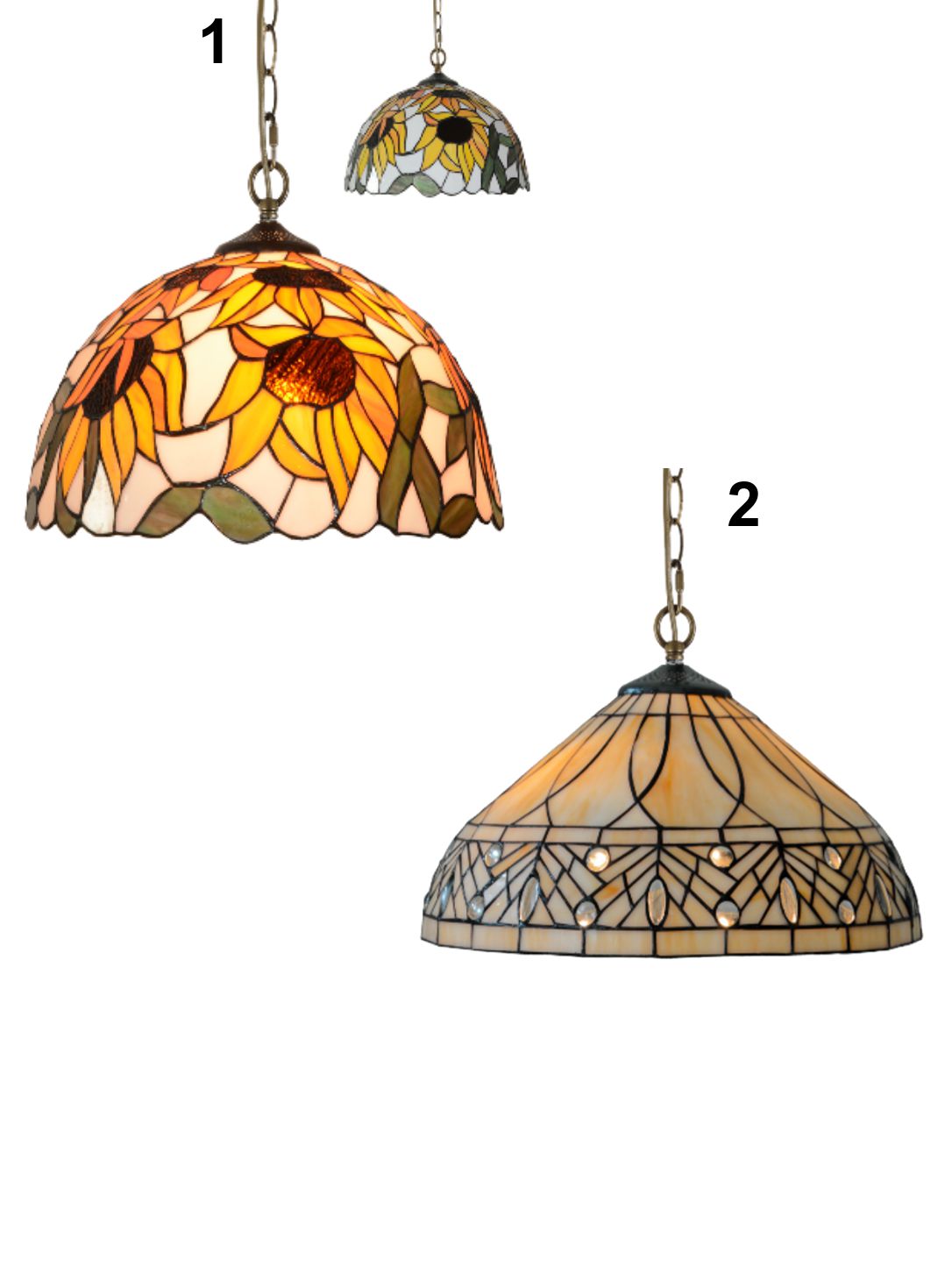 Die Kronleuchter Tiffany XXIV und Tiffany XXIII passen hervorragend zur Tiffany-Lampenfamilie. Die Lampen sind aus Metall und verziertem Glas gefertigt und verfügen über ein E27-Gewinde. Die Leuchte wird ohne Leuchtmittel geliefert. Dieses muss separat erworben werden. |
