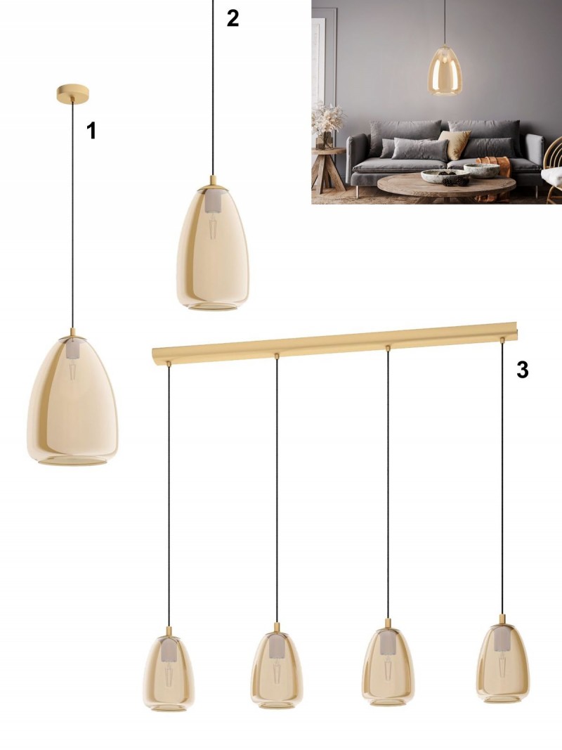 Moderne Kronleuchter aus Stahl in der Farbe gebürstetem Messing und Lampenschirme aus Glas in der Farbe Bernstein. Sie eignen sich besonders für Küchen und Esszimmer, über dem Esstisch oder der Kücheninsel, aber auch im Wohnzimmer bilden sie ein schönes Element. |