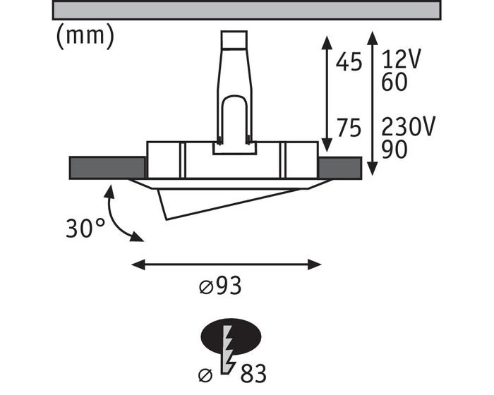 Die Leuchten werden sowohl mit GU10 (230 V) als auch mit GU5,3 (12 V - erforderlicher Transformator) geliefert - min. Die Tiefe des Zählers hängt von der verwendeten Hülse ab |