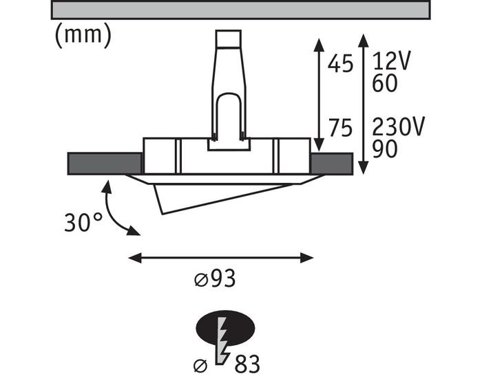 Die Leuchten werden sowohl mit GU10 (230 V) als auch mit GU5,3 (12 V - erforderlicher Transformator) geliefert - min. Die Tiefe des Zählers hängt von der verwendeten Hülse ab |