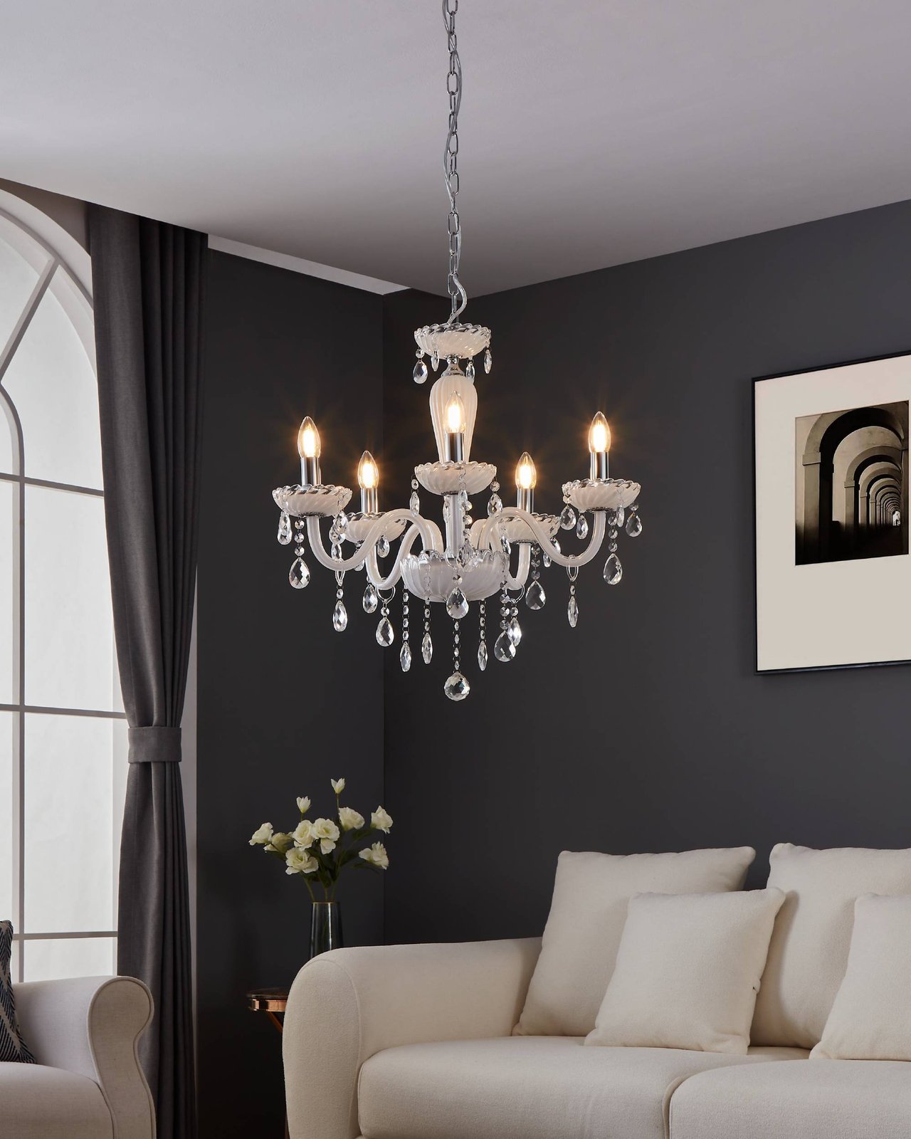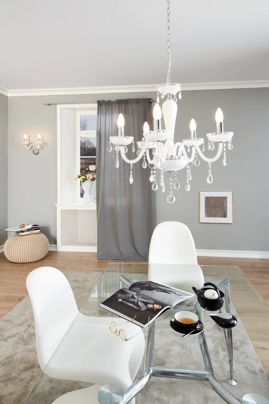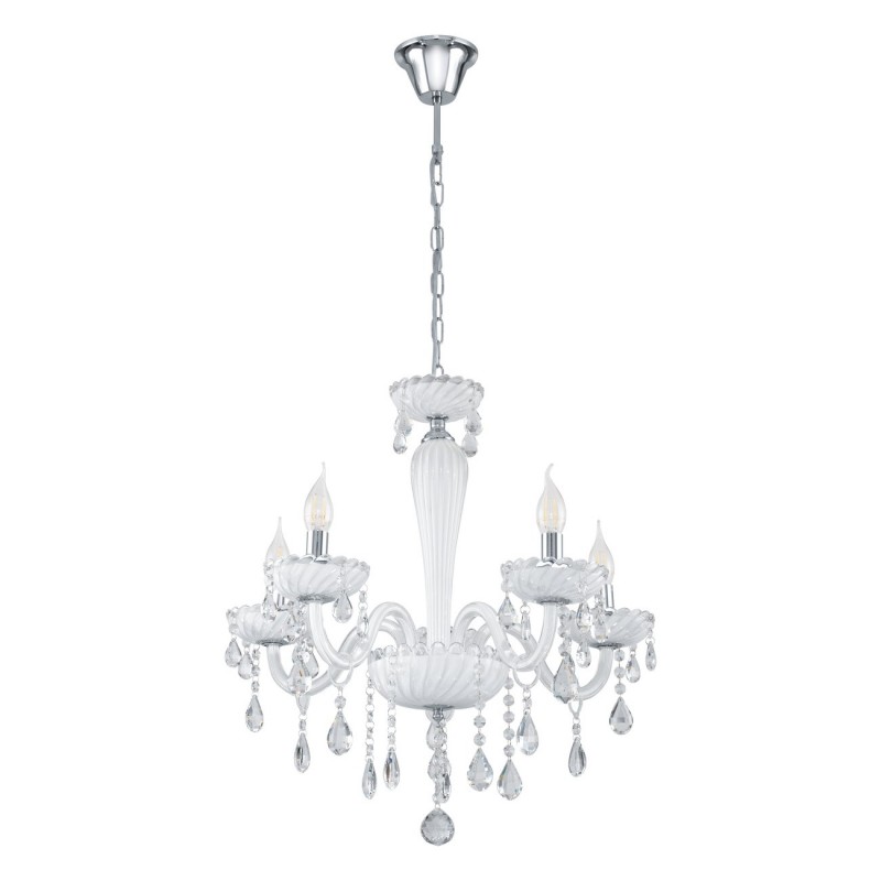 Carpento sind Kronleuchter im klassischen Stil. Sie bestehen aus chromfarbenem Stahl und weißem Glas. |