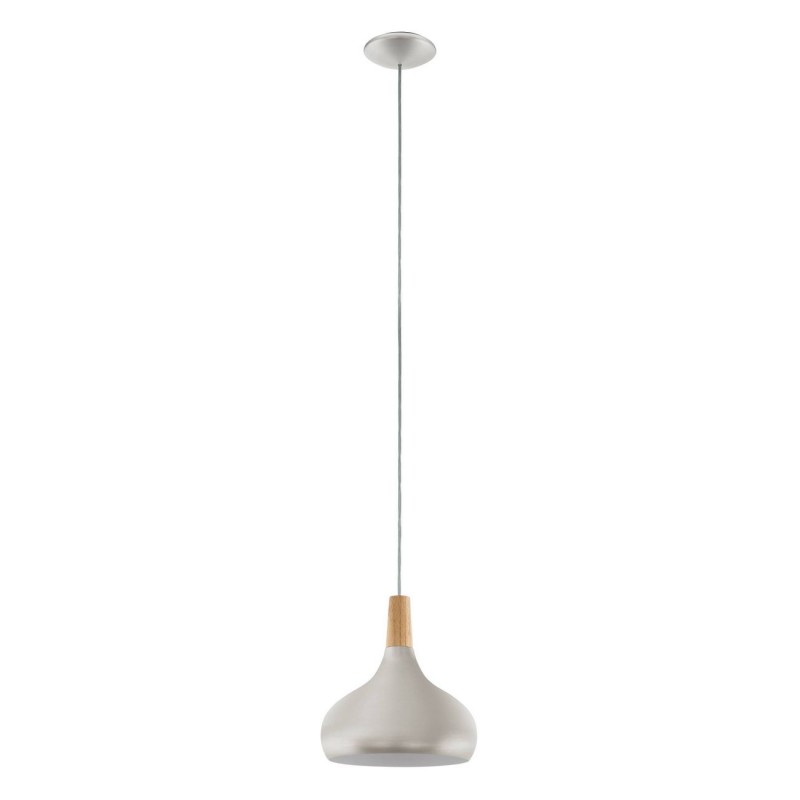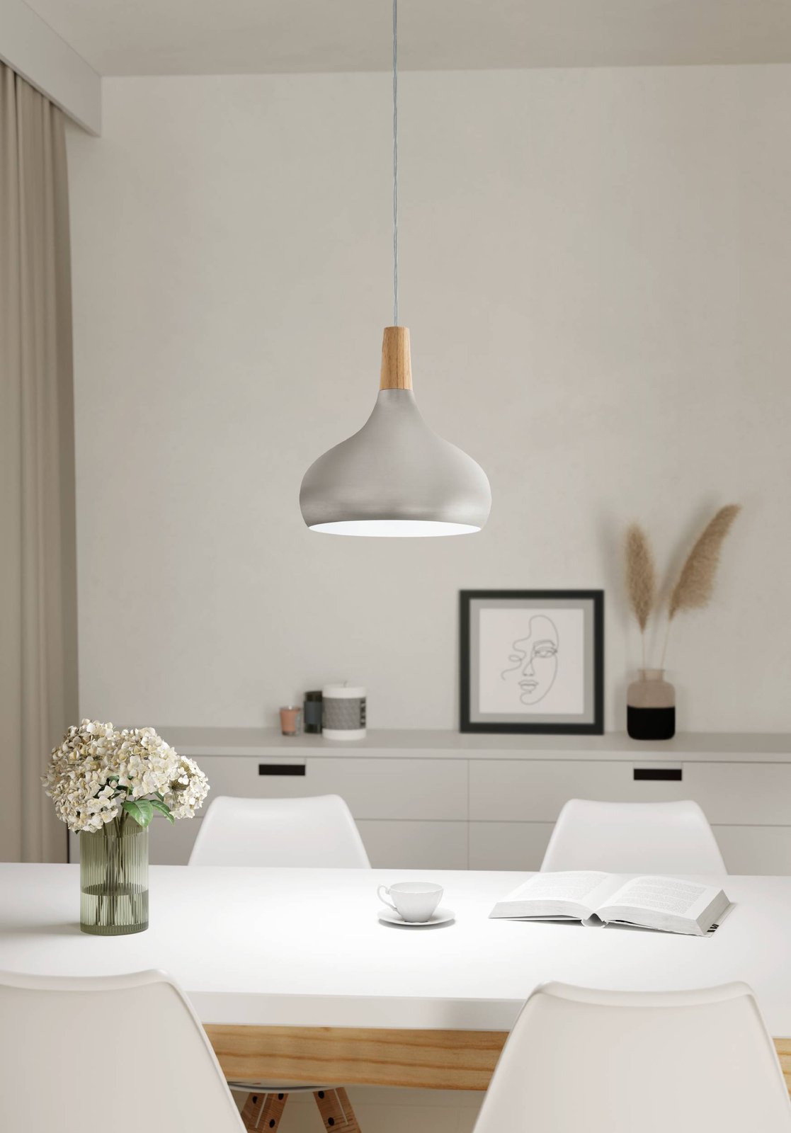 Moderne Sabinar-Pendelleuchten bestehen aus Stahl in weißer Farbe mit einem Holzelement in brauner Farbe. Sie haben ein schlichtes, klares Design und passen in jedes Interieur.