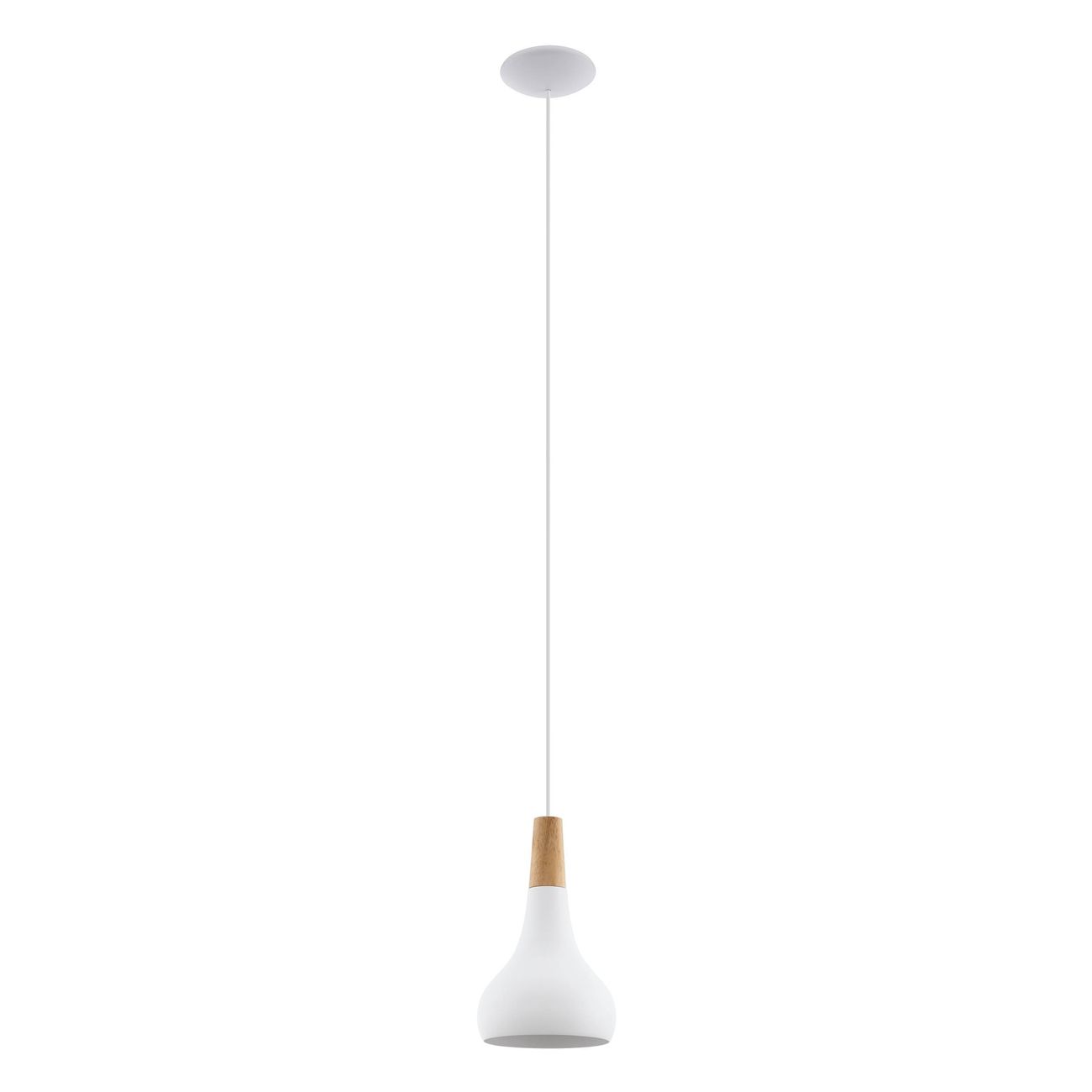 Moderne Sabinar-Pendelleuchten bestehen aus Stahl in weißer Farbe mit einem Holzelement in brauner Farbe. Sie haben ein schlichtes, klares Design und passen in jedes Interieur.
