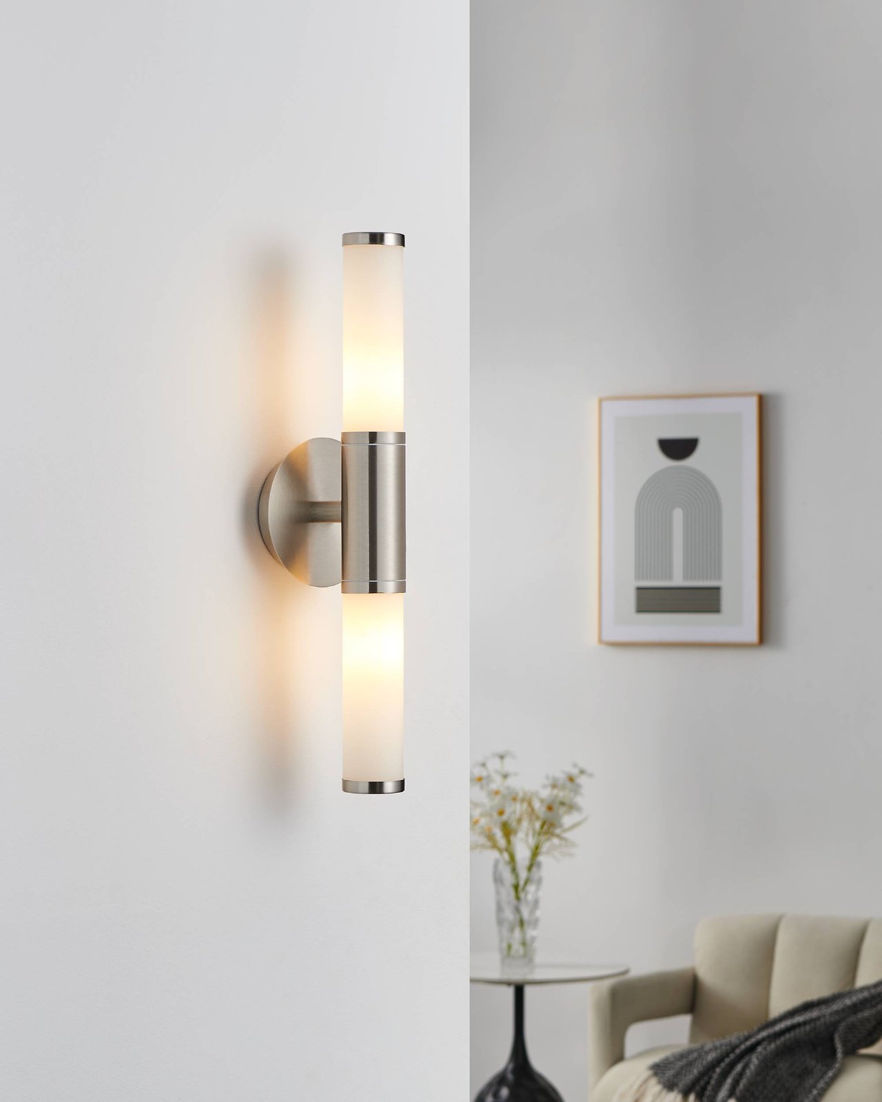 Die schlichte Leuchte Palmera ist aus Metall und weißem Opalglas gefertigt. Sie kann über oder neben einem Schrank angebracht werden, sowohl horizontal als auch vertikal. |