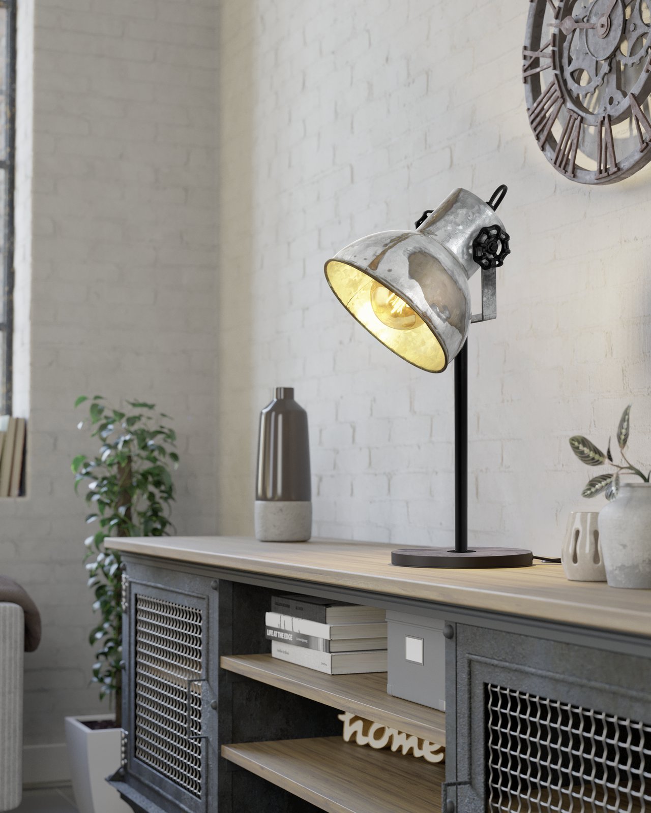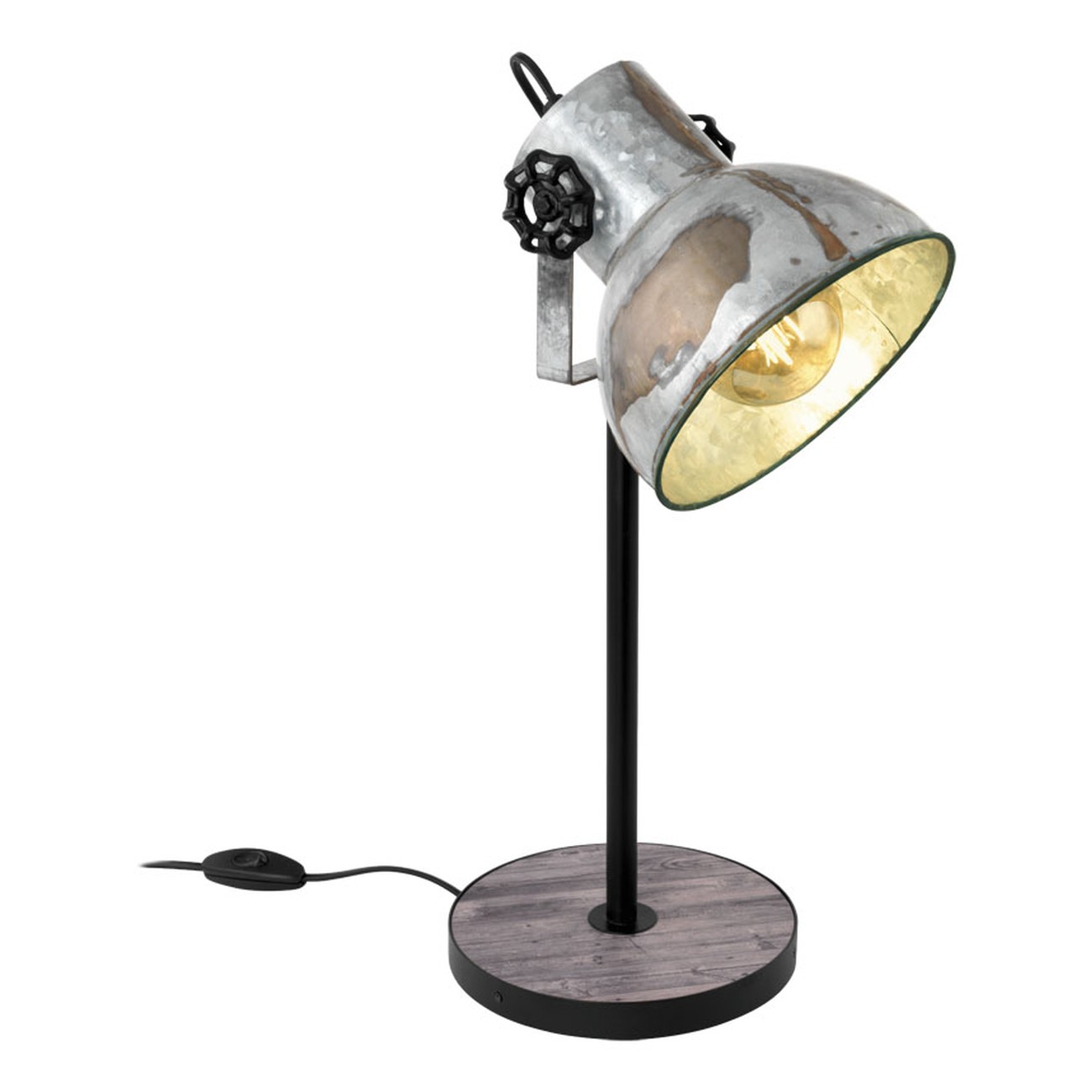 Interessante Strahler aus Stahl und Holz. Die Lampen haben einen sehr ausgeprägten, industriellen Charakter. Der Sockel hat eine braune Farbe und die Lampenschirme sind im Patina-Look von rostigem Zink gehalten. |