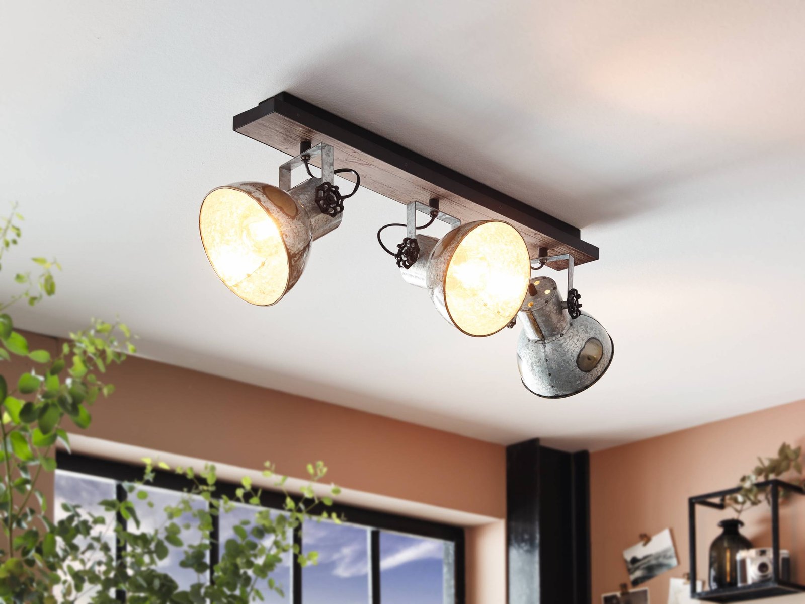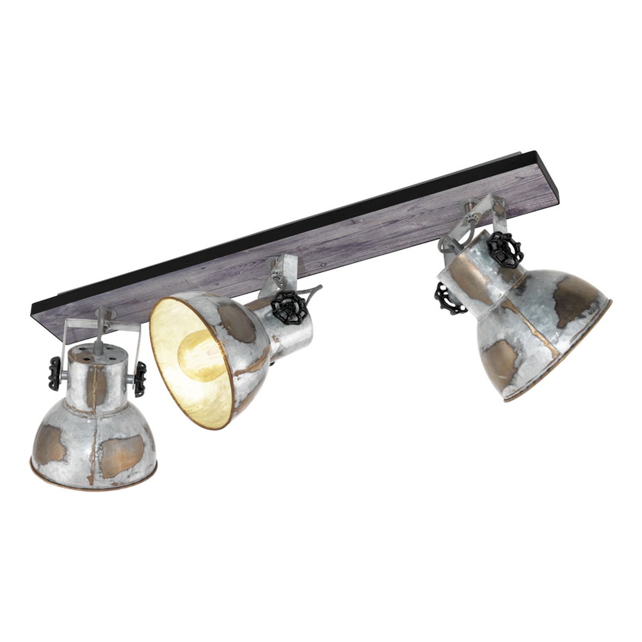Interessante Strahler aus Stahl und Holz. Die Lampen haben einen sehr ausgeprägten, industriellen Charakter. Der Sockel hat eine braune Farbe und die Lampenschirme sind im Patina-Look von rostigem Zink gehalten. |