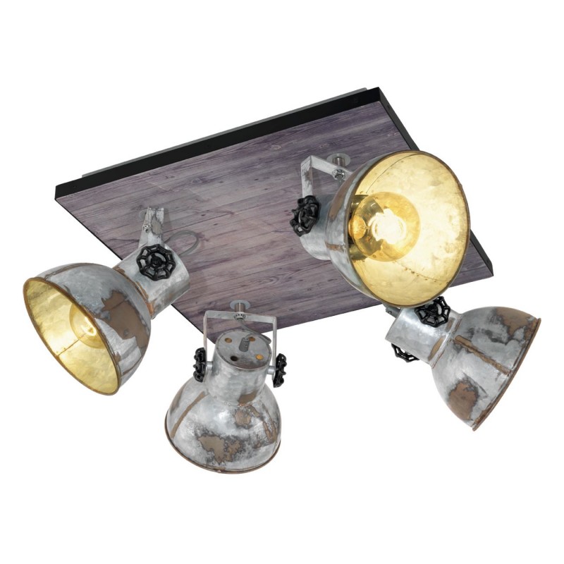 Interessante Strahler aus Stahl und Holz. Die Lampen haben einen sehr ausgeprägten, industriellen Charakter. Der Sockel hat eine braune Farbe und die Lampenschirme sind im Patina-Look von rostigem Zink gehalten. |