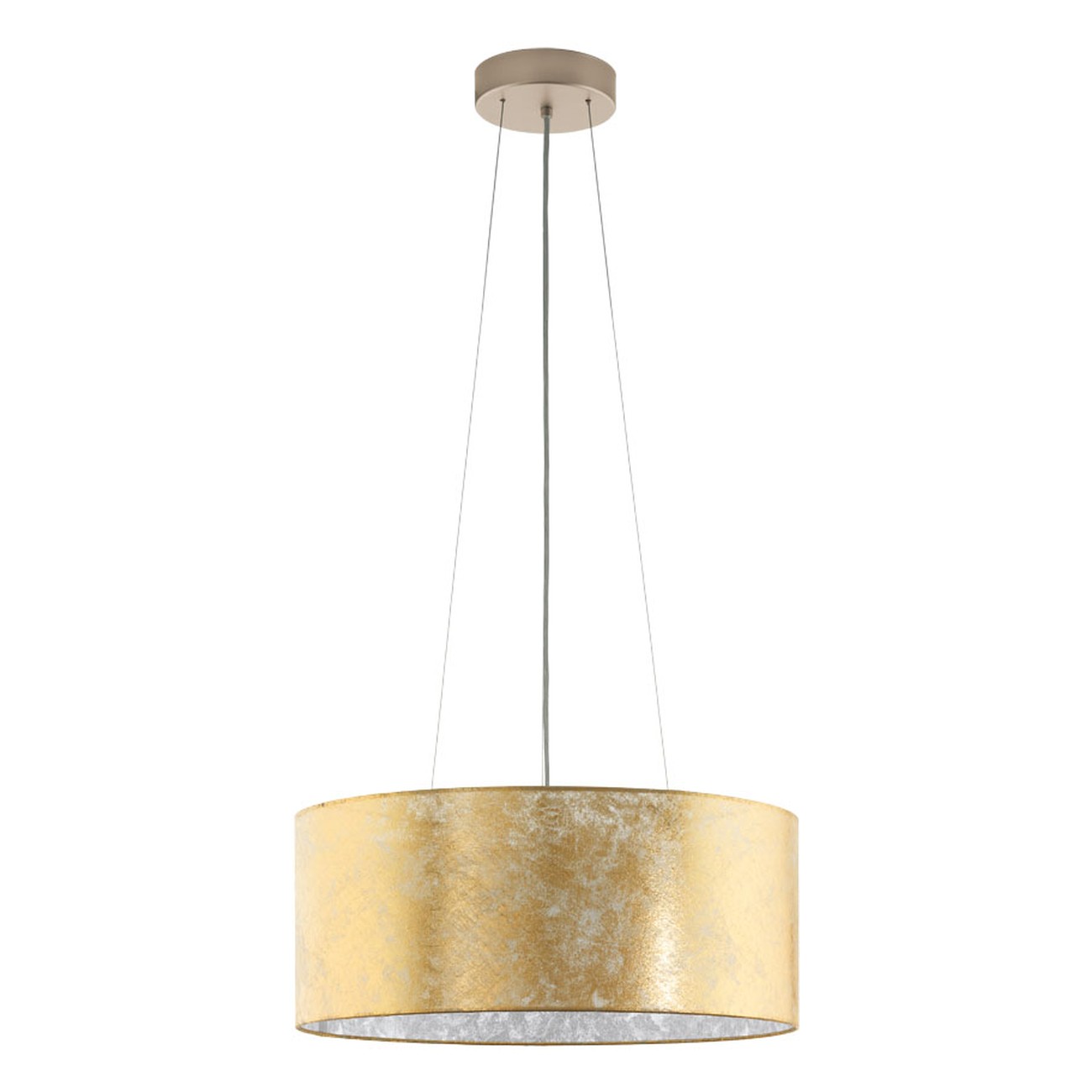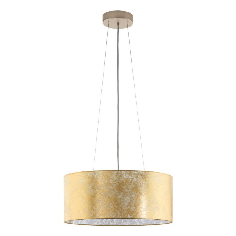Die modernen Viserbella-Lampen bestehen aus Stahl in der Farbe Champagner und Textil in der Farbe Gold. |