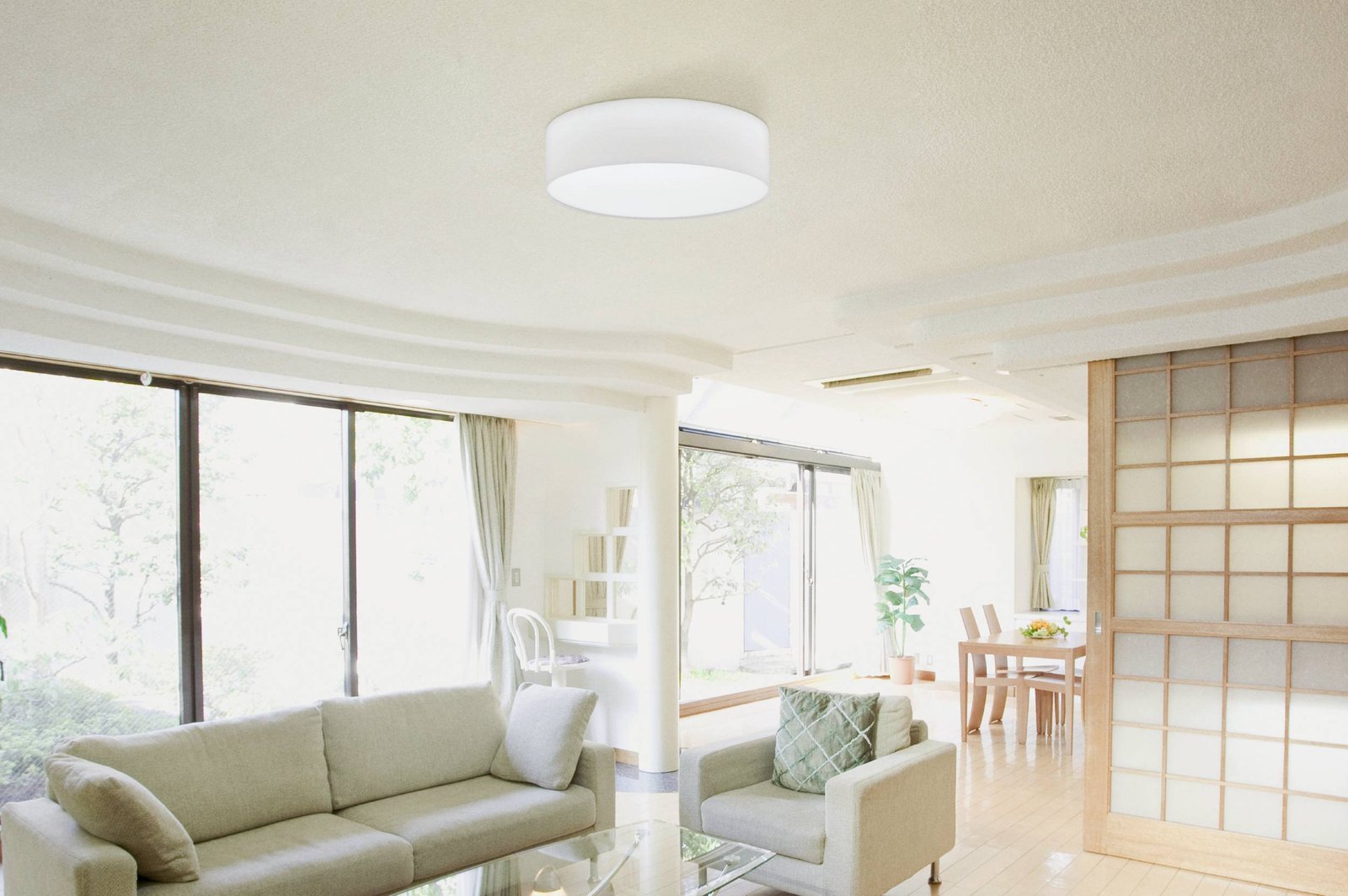 Runde, schlichte, aber sehr moderne und geschmackvolle Deckenleuchten aus Stahl und Textil in Weiß. Es passt in alle modernen Innenräume und wird dort eine geschmackvolle Ergänzung sein.