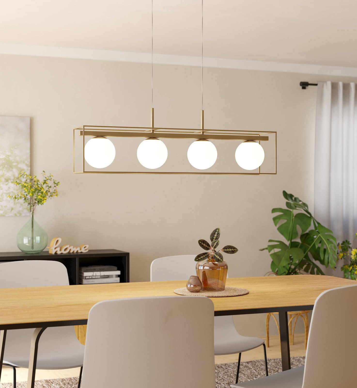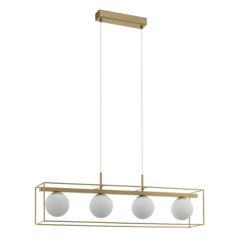 Stilvolle Pendelleuchte Vallaspra. Es besteht aus Stahl in Champagnerfarbe und satiniertem Opalglas. Es eignet sich nicht nur für die Küche über der Kücheninsel und das Esszimmer über dem Esstisch, sondern auch für das Wohnzimmer. |