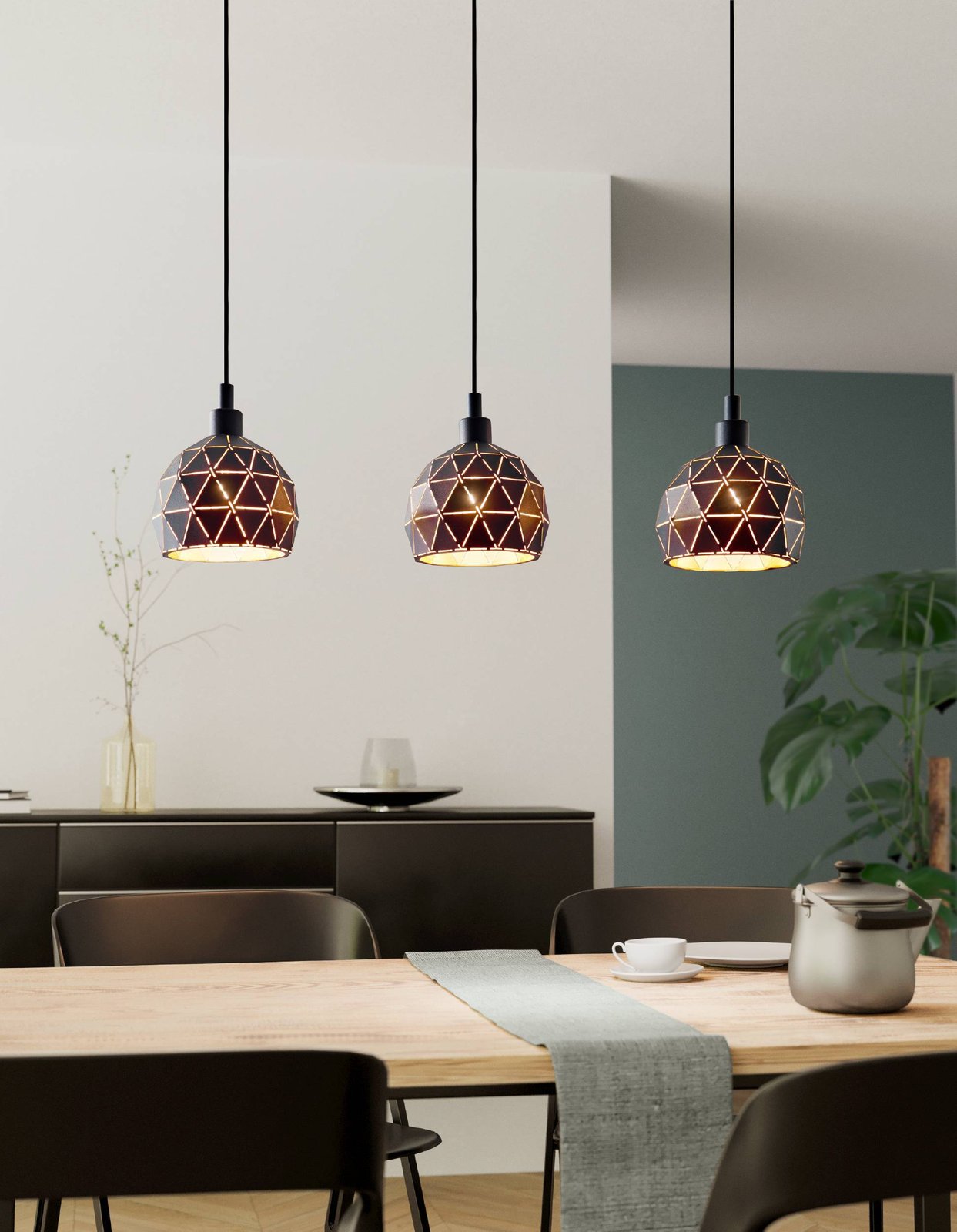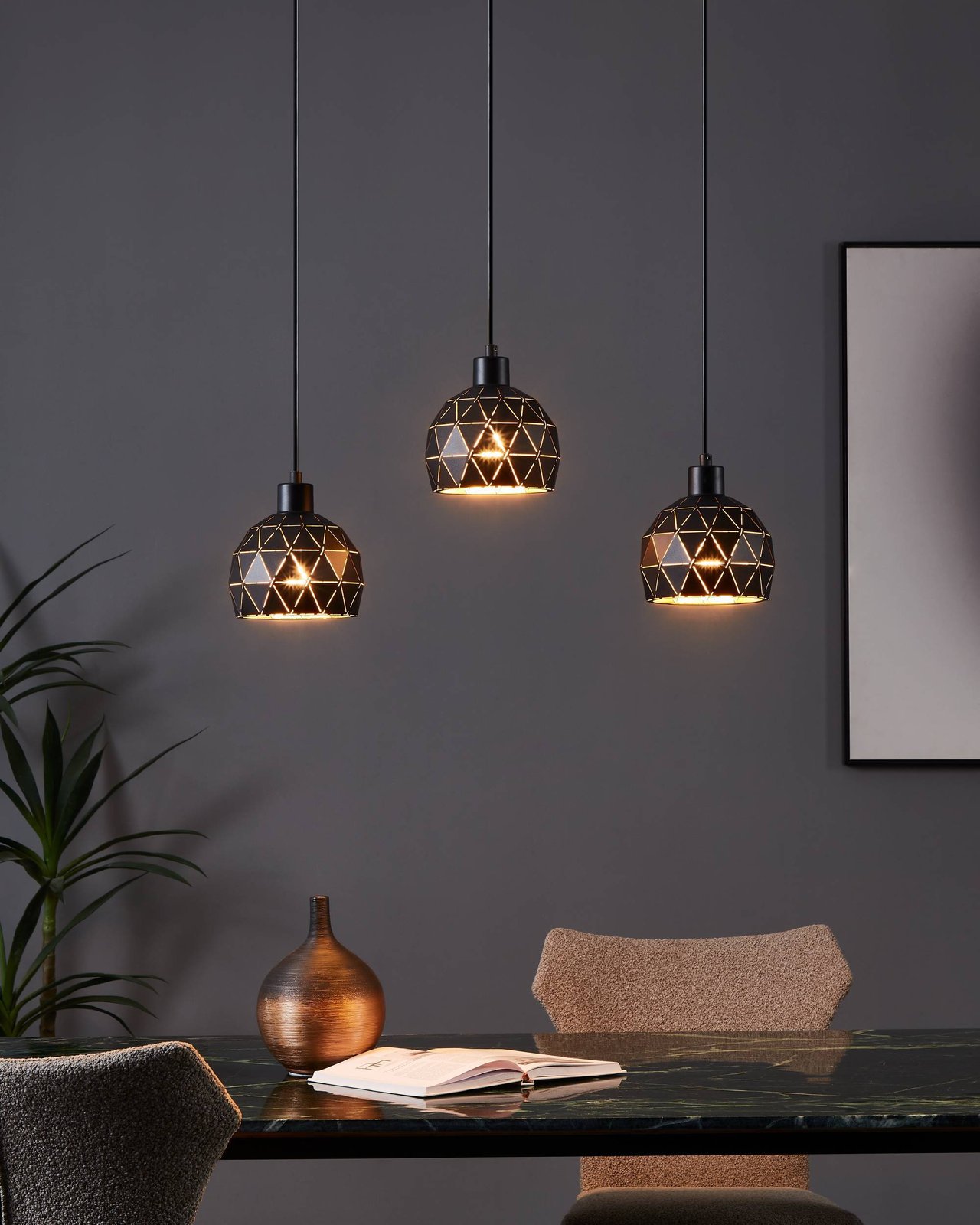 Sehr interessante Lampen aus Stahl in schwarzer Farbe, die Innenseite des Lampenschirms ist goldfarben. Sie eignen sich besonders für Esszimmer und Küchen über der Kücheninsel, werden aber auch im Wohnzimmer ein interessantes Element sein.