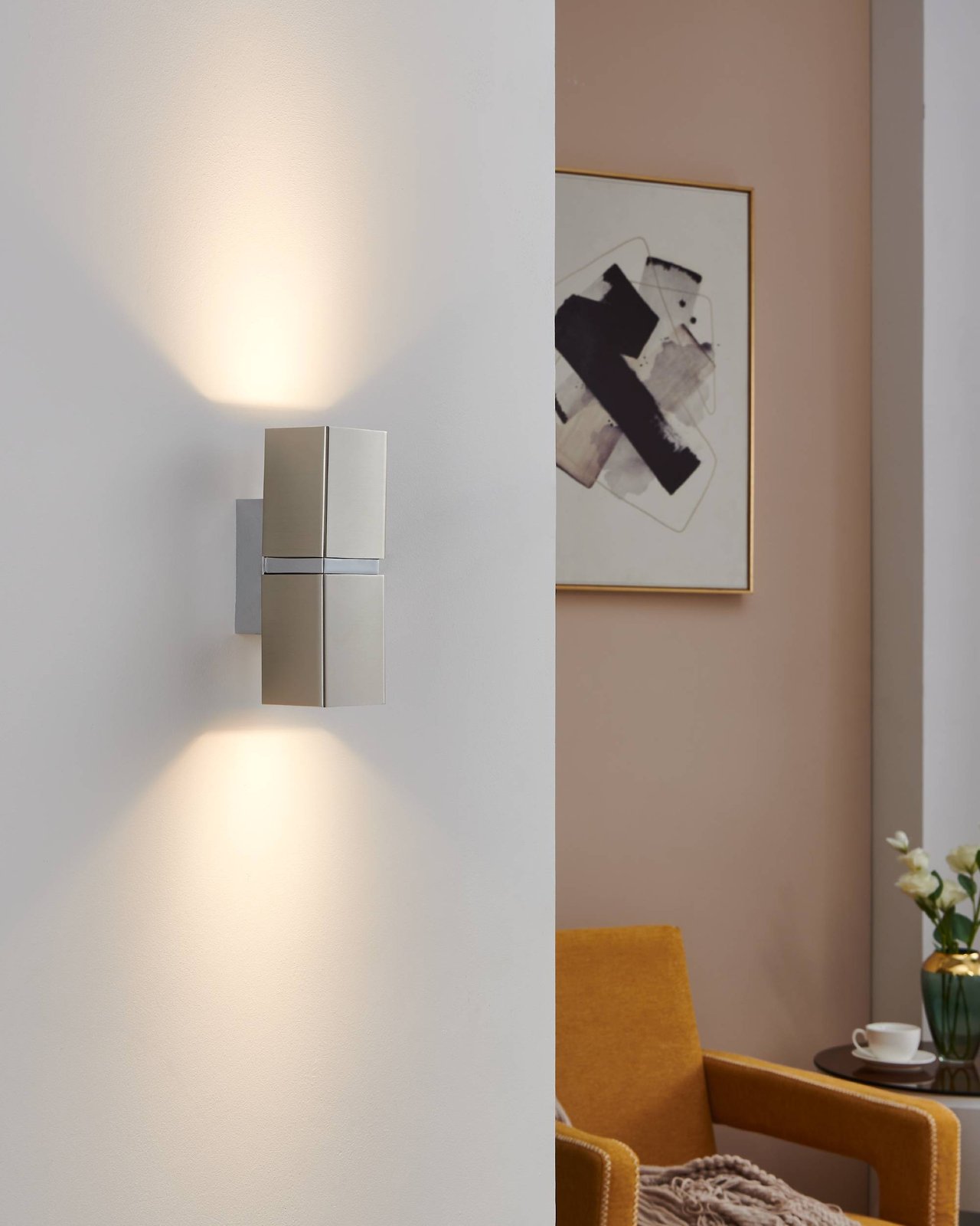 Moderne Wandleuchten eignen sich zur Beleuchtung von Fluren, Fluren, aber auch Wohnzimmern usw. Sie sind aus Stahl gefertigt. Es leuchtet auf und ab, was im beleuchteten Zustand sehr effektvoll aussieht. Die Lampen werden mit Leuchtmitteln mit GU10-Fassung geliefert, die in einem warmweißen Farbton leuchten. Es ist jedoch möglich, intelligente LED-Leuchtmittel zu erwerben und die Leuchtmittel zu dimmen und die Temperatur und Farbe der Beleuchtung über eine App auf Ihrem Smartphone zu ändern. |