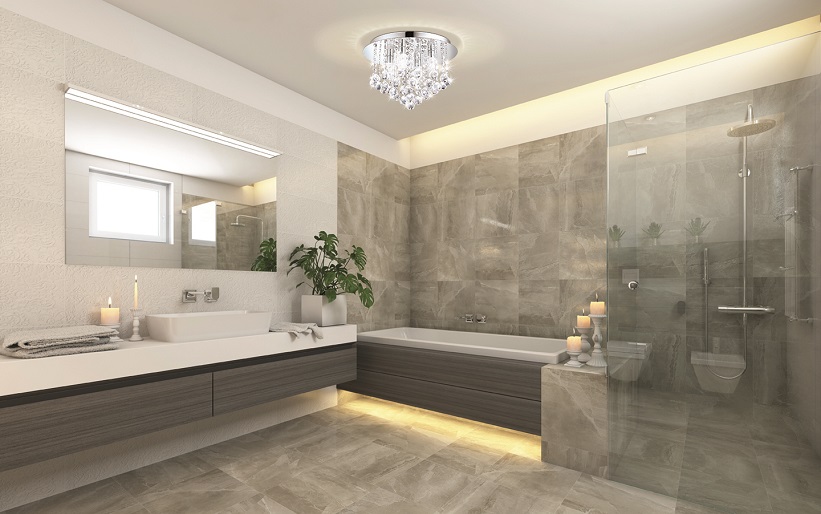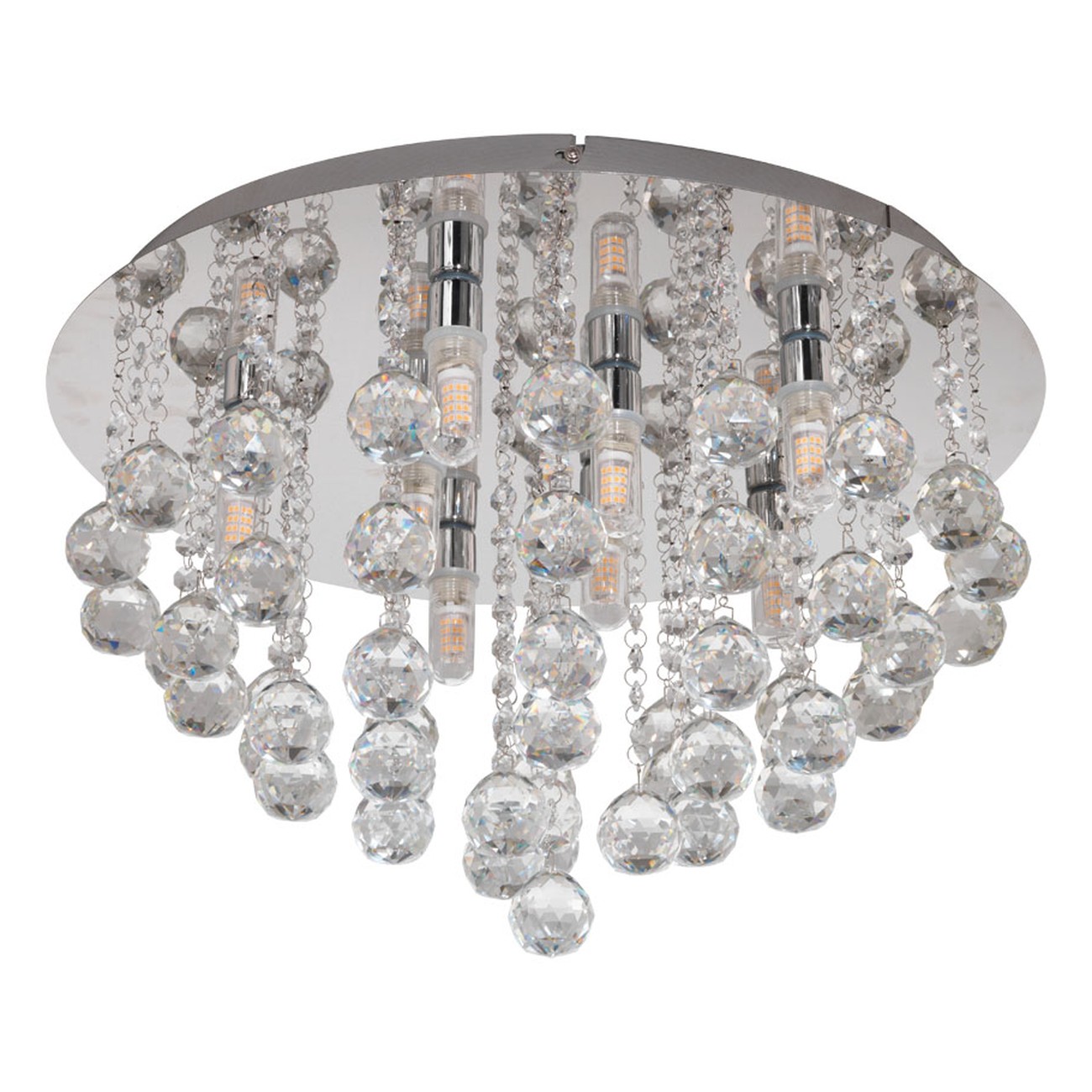 Kristall-Deckenleuchte im modernen Look, die dank IP44-Schutz auch für Badezimmer geeignet ist. Es besteht aus chromfarbenem Stahl und klaren, brillanten Kristallen. |