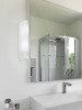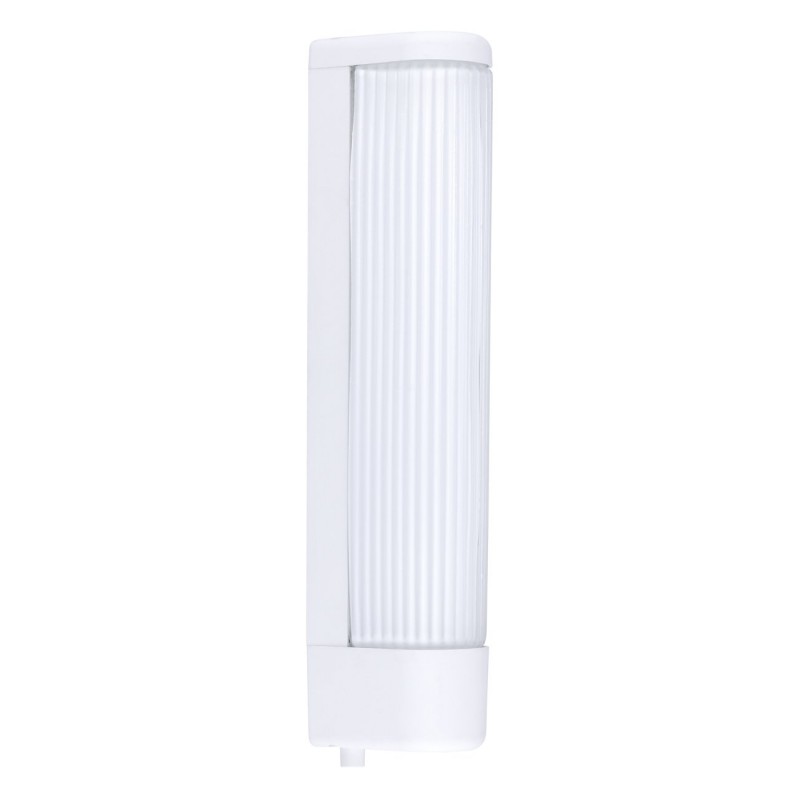 Wandmontierte Badezimmerleuchte aus Kunststoff und Glas in Weiß. Die Lampe verfügt über eine integrierte Steckdose, in die Sie beispielsweise einen Haartrockner oder einen Rasierer bequem anschließen können. Das Licht wird durch den Schalter am Lampenkörper ausgeschaltet.