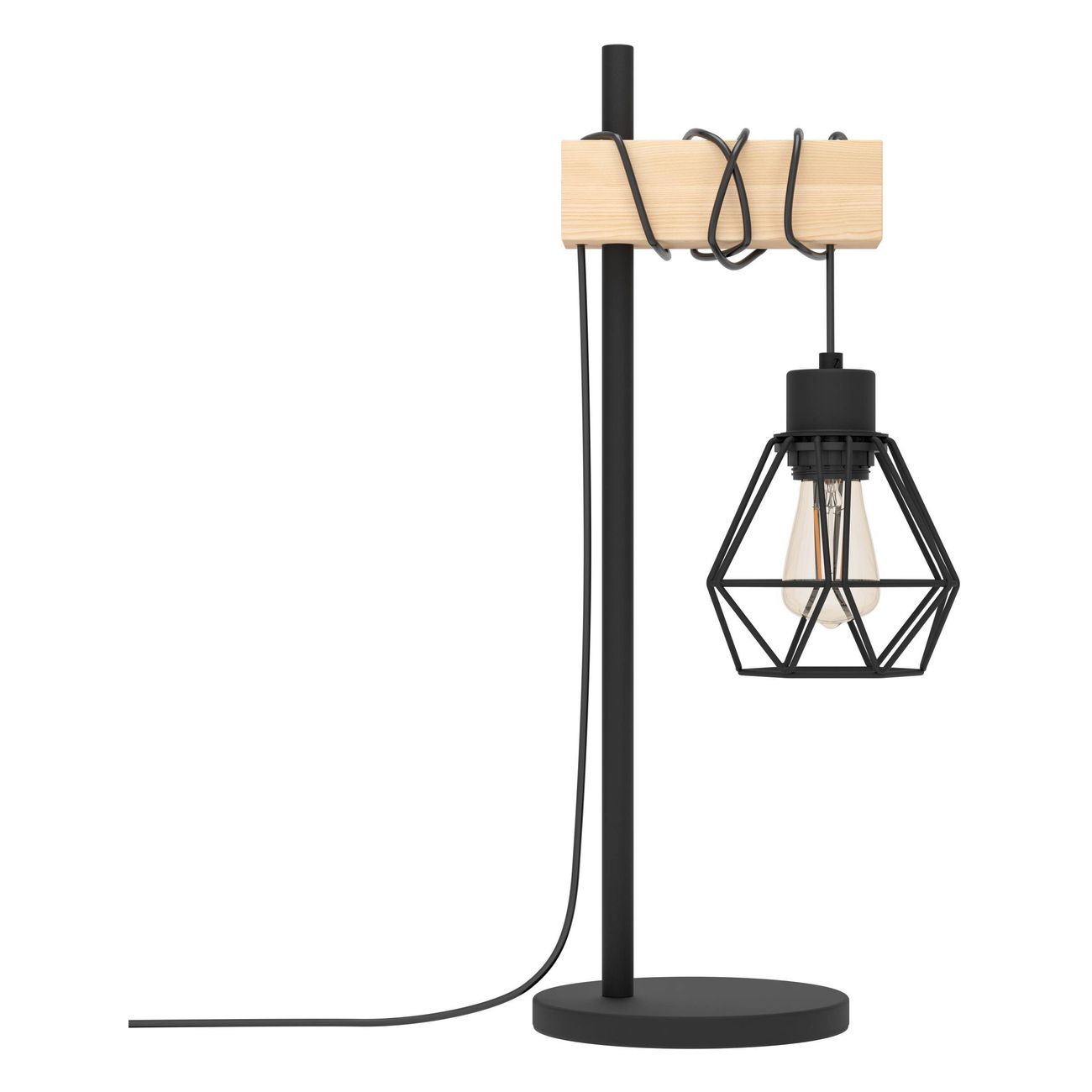 Die stilvolle Townshend-Lampe und -Leuchte bestehen aus schwarzem Metall und Naturholz. Sie können eine passende Retro-Glühbirne einbauen, die den Charakter dieser Lampe noch verstärkt. |