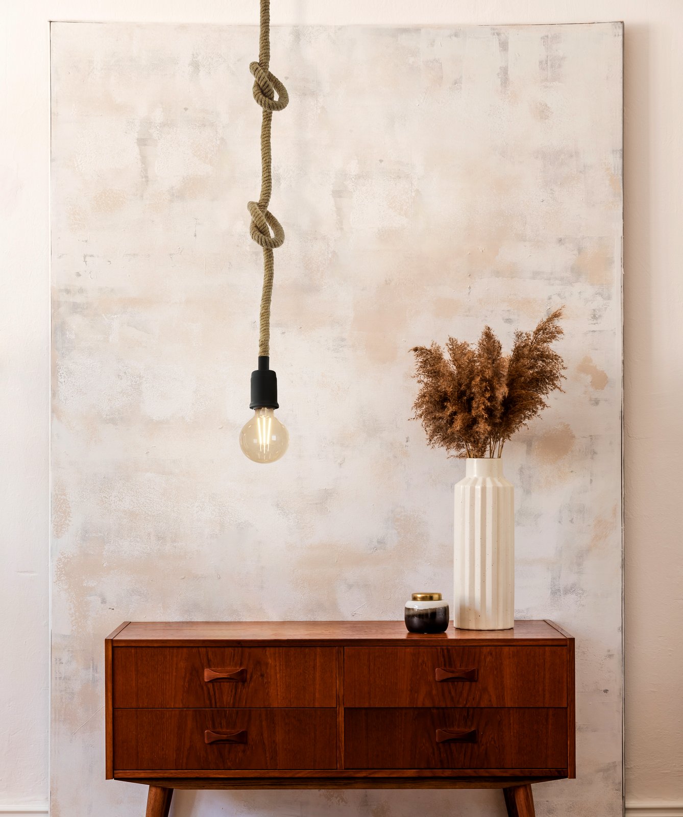 Stilvolle Lampen im Vintage-Stil, geeignet für Küchen, Esszimmer und Wohnzimmer. Sie bestehen aus Stahl und einem Seil, an dem die Detektoren angebracht sind. |
