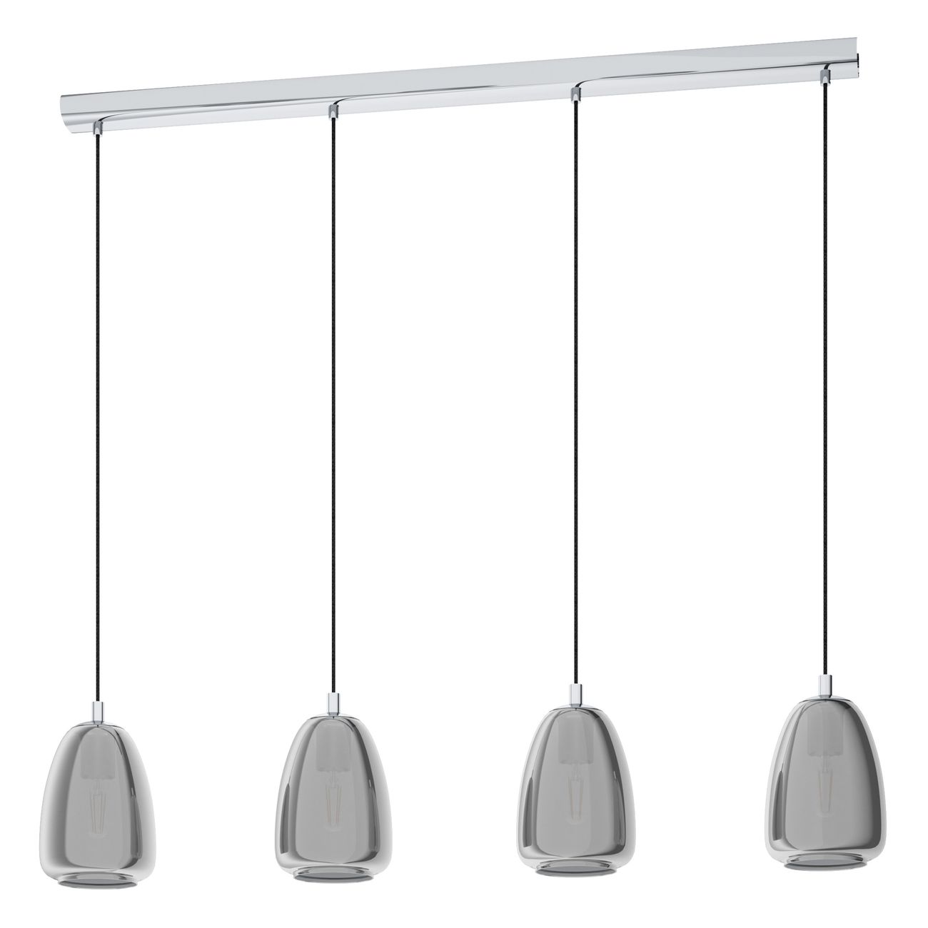 Moderne Kronleuchter aus chromfarbenem Stahl, Lampenschirme aus rauchfarbenem Glas. Sie eignen sich besonders für Küchen und Esszimmer, über dem Esstisch oder der Kücheninsel. |