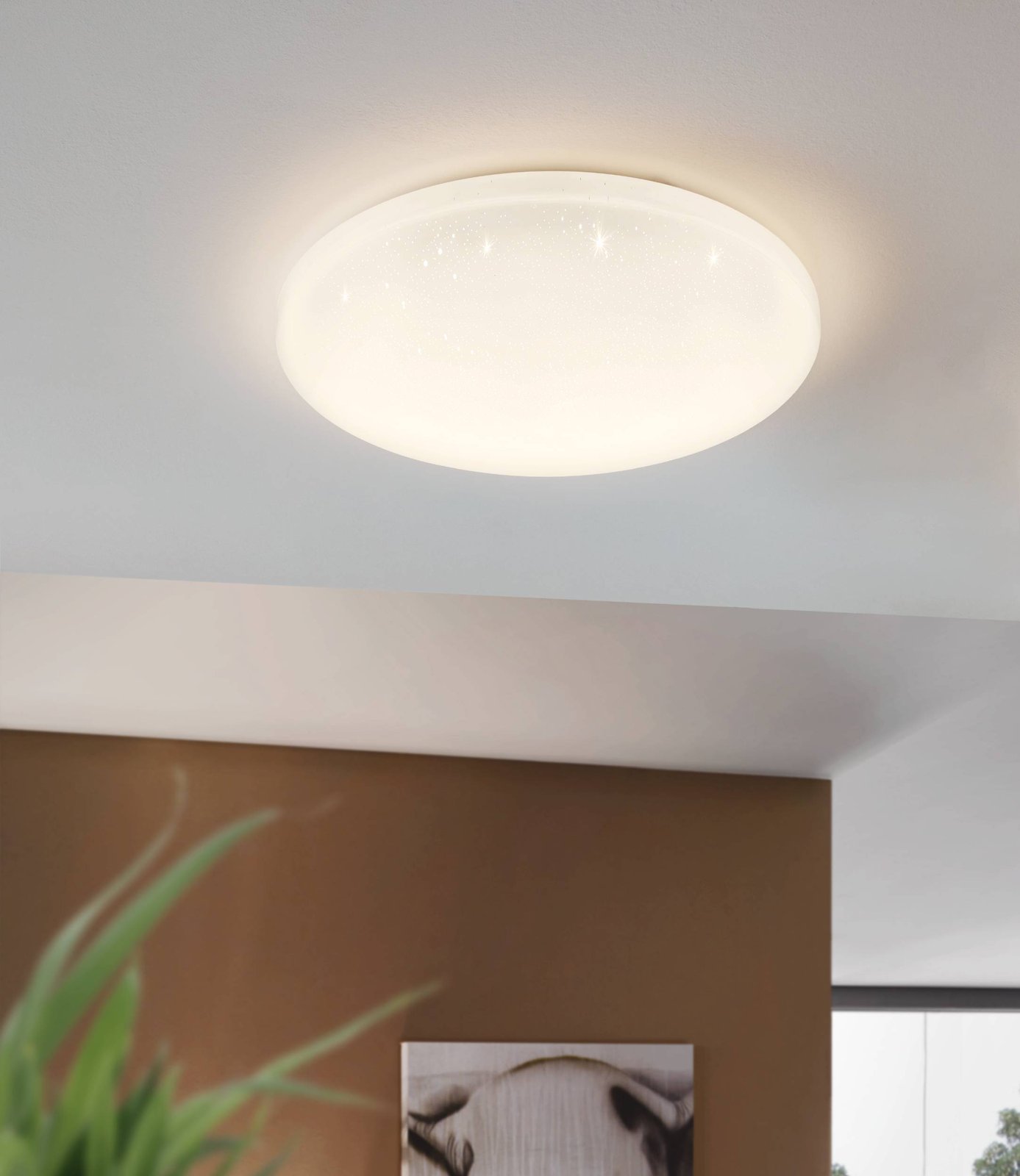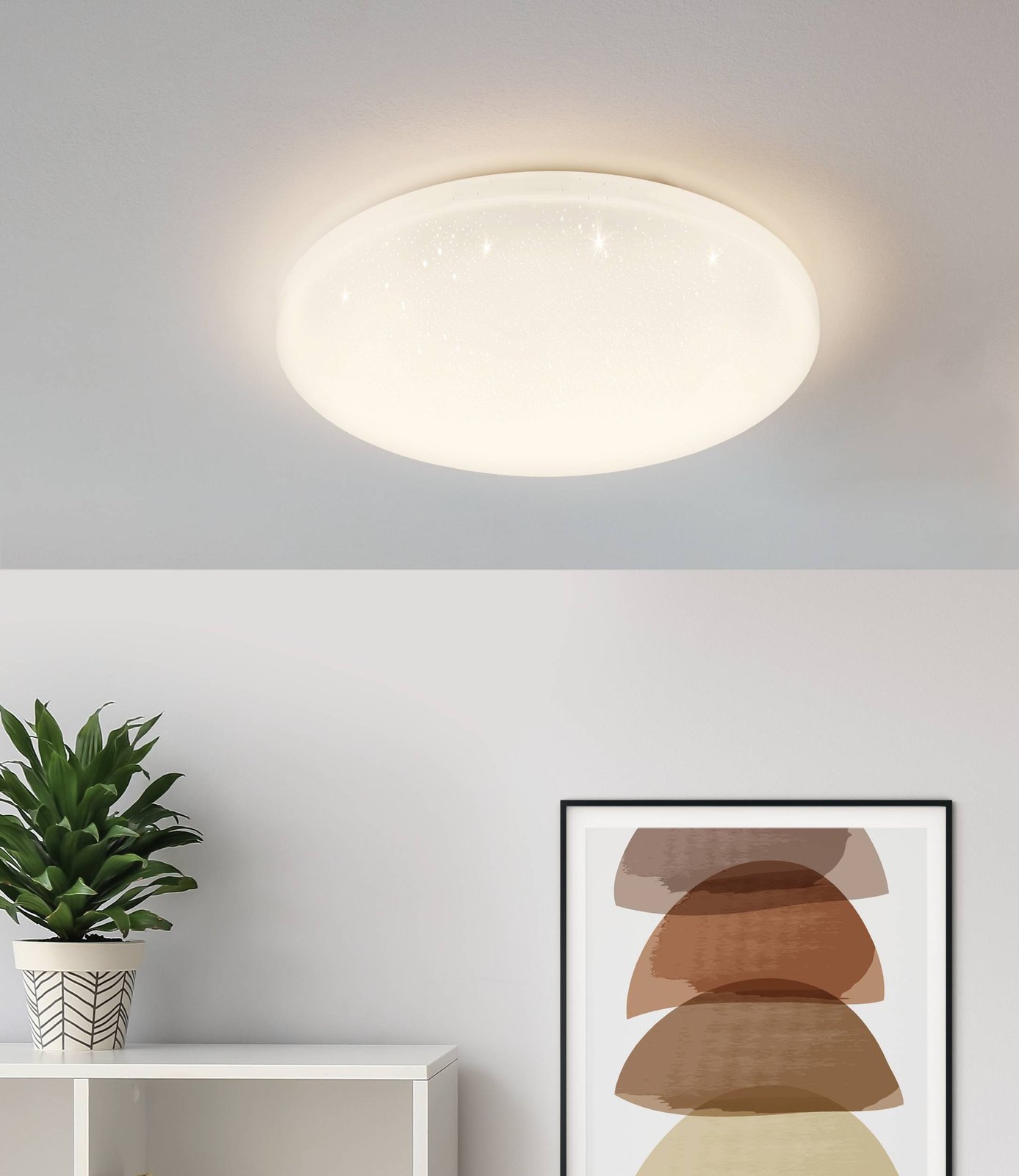 Moderne Deckenleuchten mit der Möglichkeit, diese auch an der Wand zu platzieren. Sie bestehen aus Stahl und Kunststoff in weißer Farbe mit Glitzereffekt. Dadurch eignen sie sich nicht nur für das Wohn- und Schlafzimmer, sondern auch für das Kinderzimmer oder den Flur. Diese Lampen strahlen in einem warmweißen Farbton und sind nicht dimmbar.