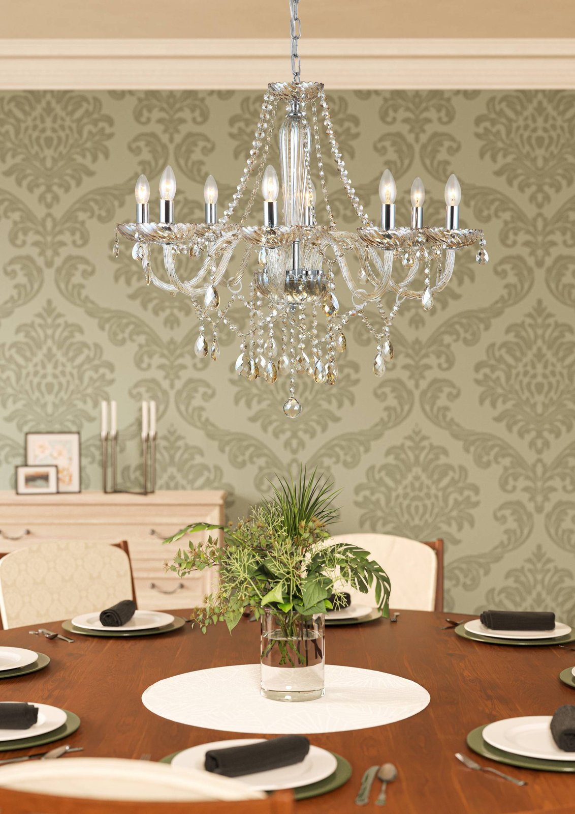 Basilano sind Kronleuchter im klassischen Stil. Sie bestehen aus Stahl in der Farbe Chrom und Glas in der Farbe Cognac. |