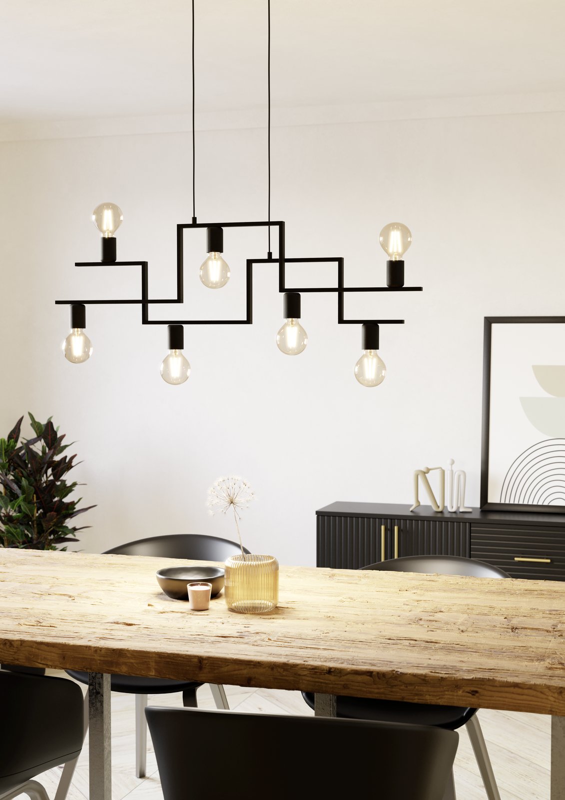 Design- und stilvoller Kronleuchter, geeignet für Wohnzimmer, Küche und Esszimmer. Es besteht aus Stahl in schwarzer Farbe. |
