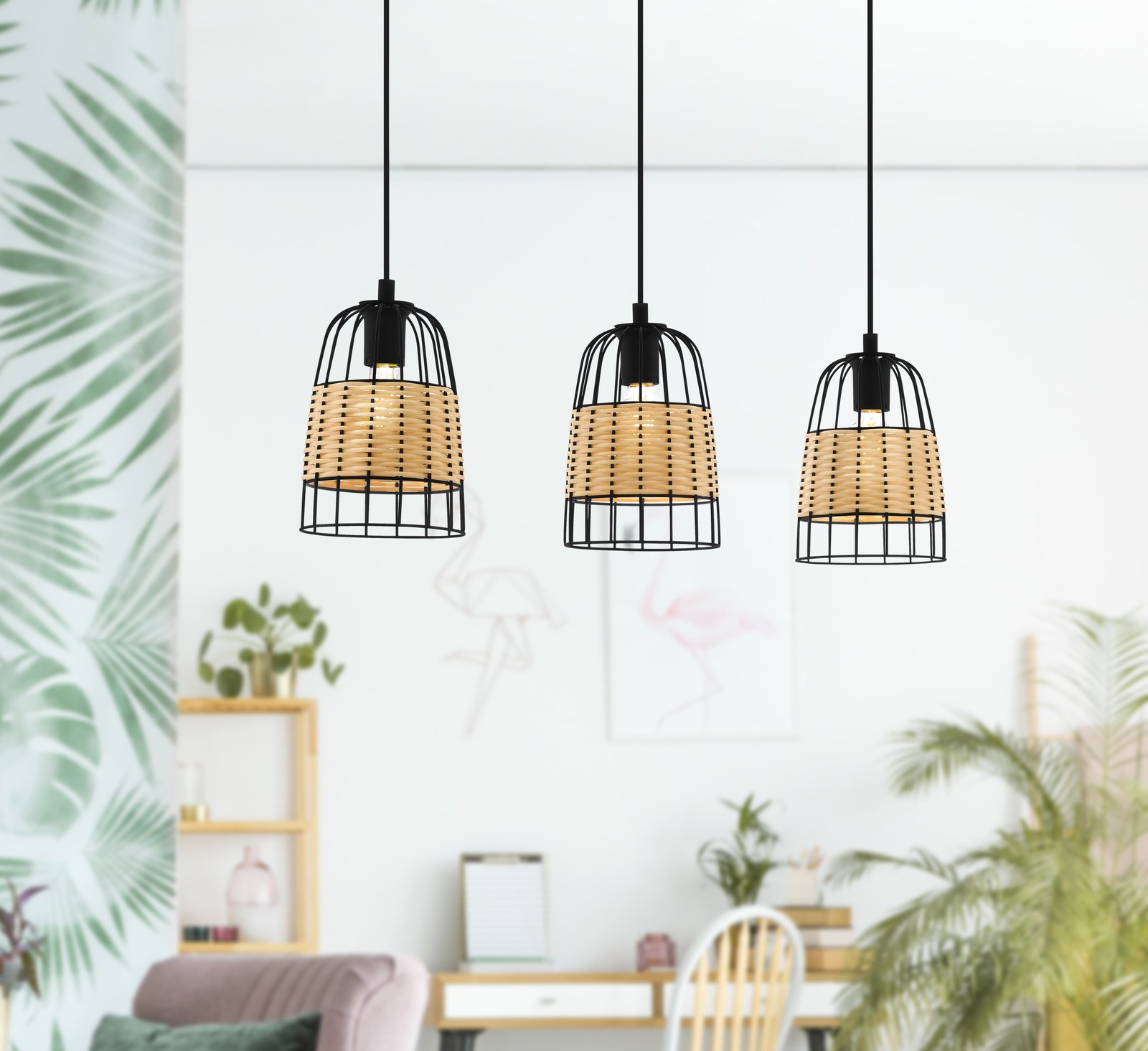 Anwick-Armaturen bestehen aus schwarzem Stahl und der Schirm ist eine Kombination aus schwarzem Stahl und natürlichem Rattan. Sie haben ein sehr interessantes Design. |