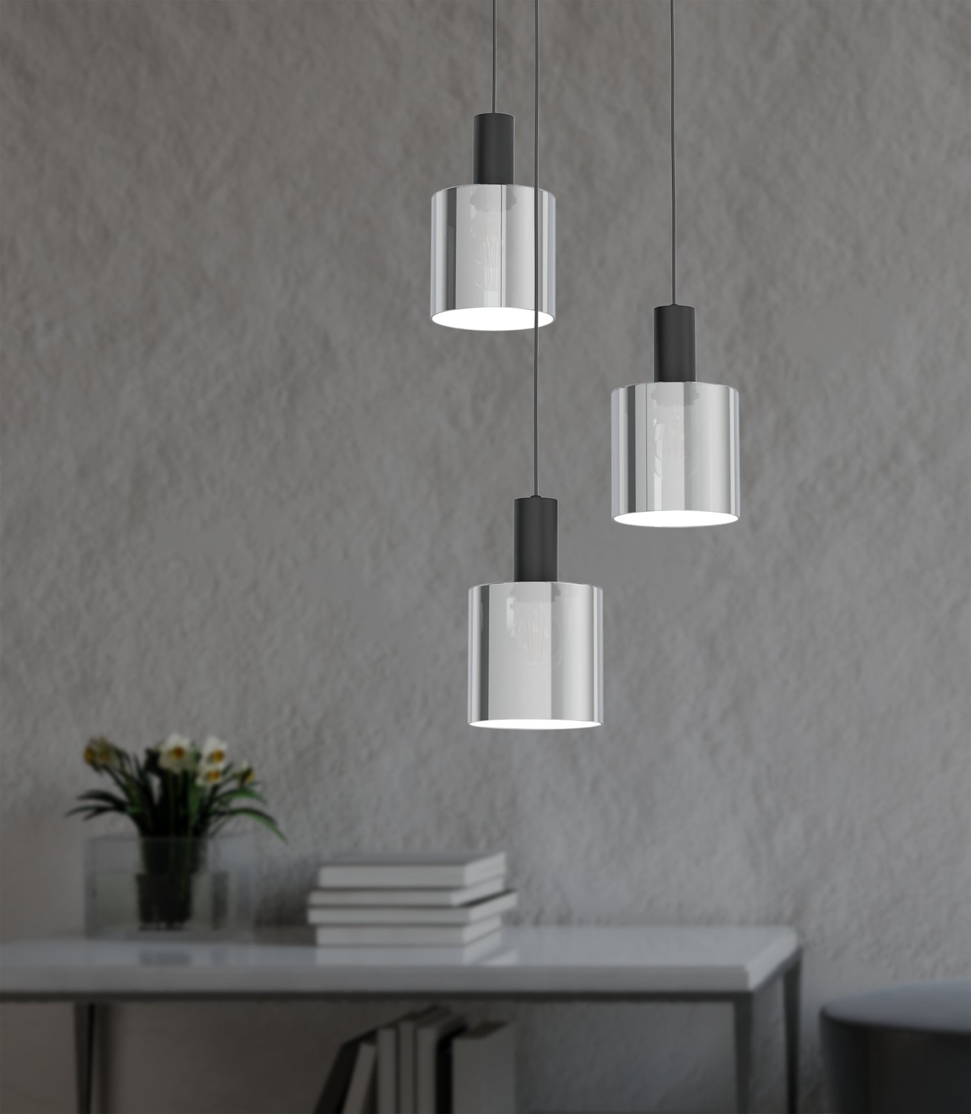 Einfache, moderne Gorosiba-Kronleuchter sind eine schöne Ergänzung für Ihre Küche und Ihr Esszimmer. oder Wohnzimmer. Sie bestehen aus Stahl in schwarzer Farbe und Glas in schwarzer transparenter Farbe.