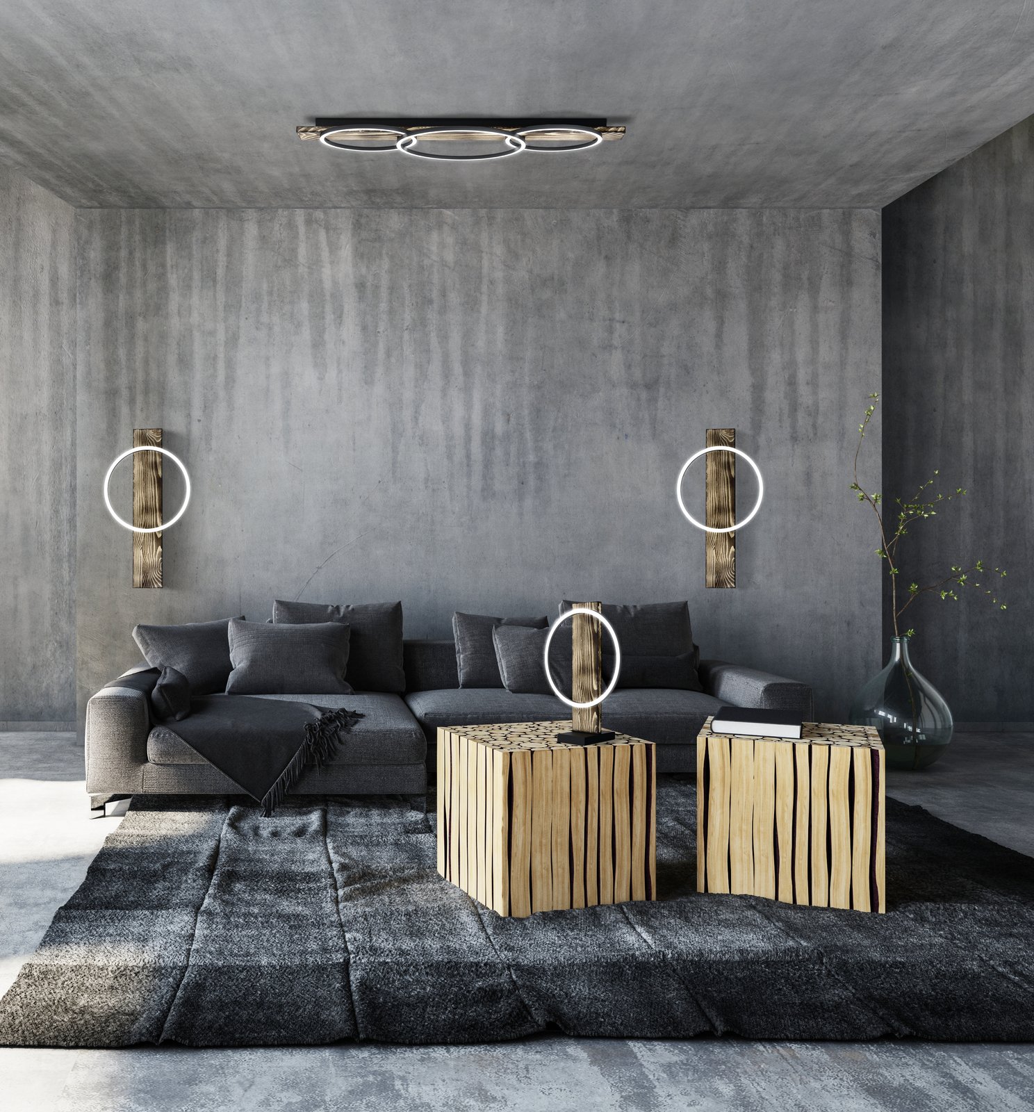 Lampen mit interessantem Design, passend für alle modernen Innenräume. Der Sockel der Lampe besteht aus Holz und die runden Schirme sind aus Stahl in Schwarz und Kunststoff in Weiß.