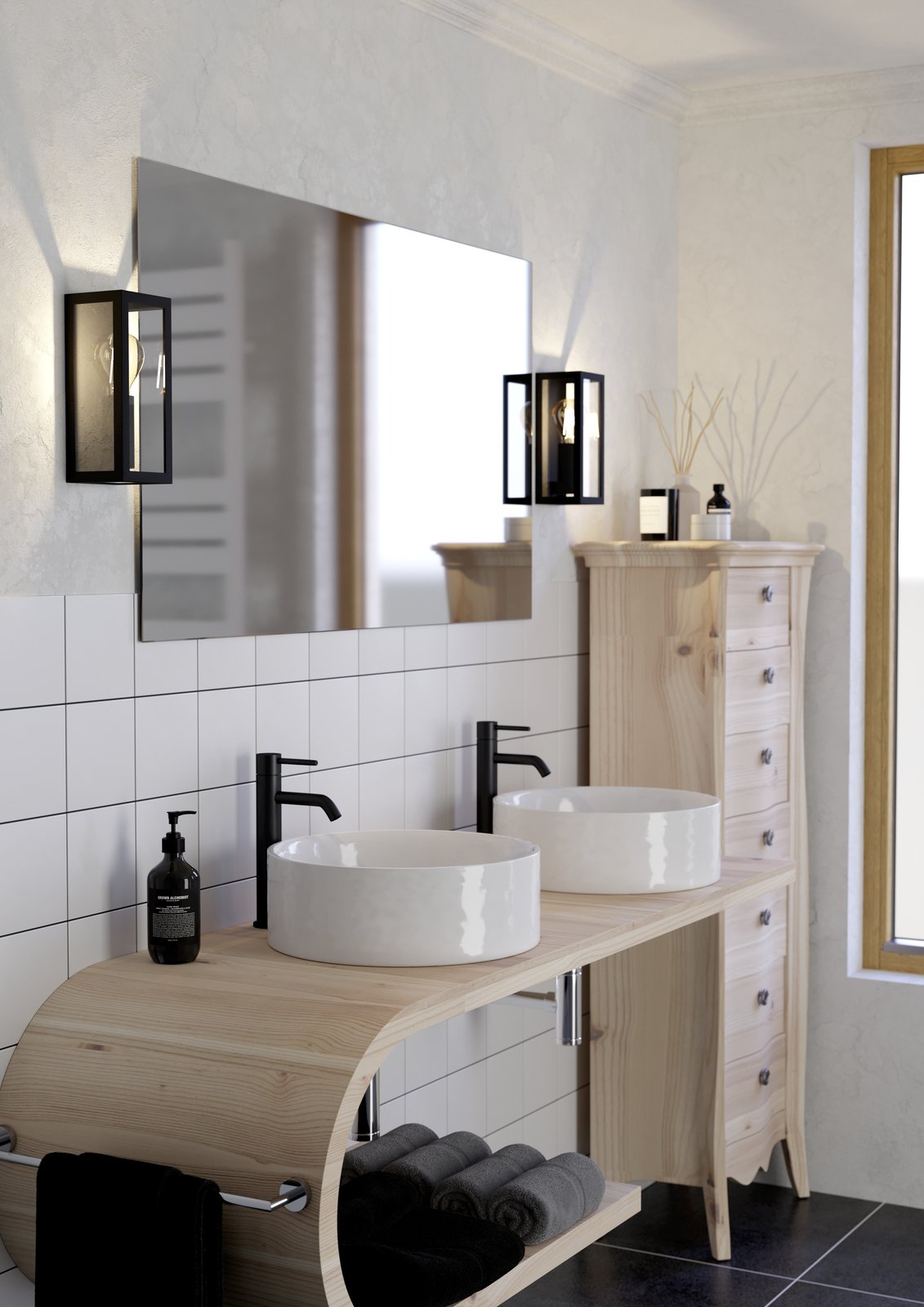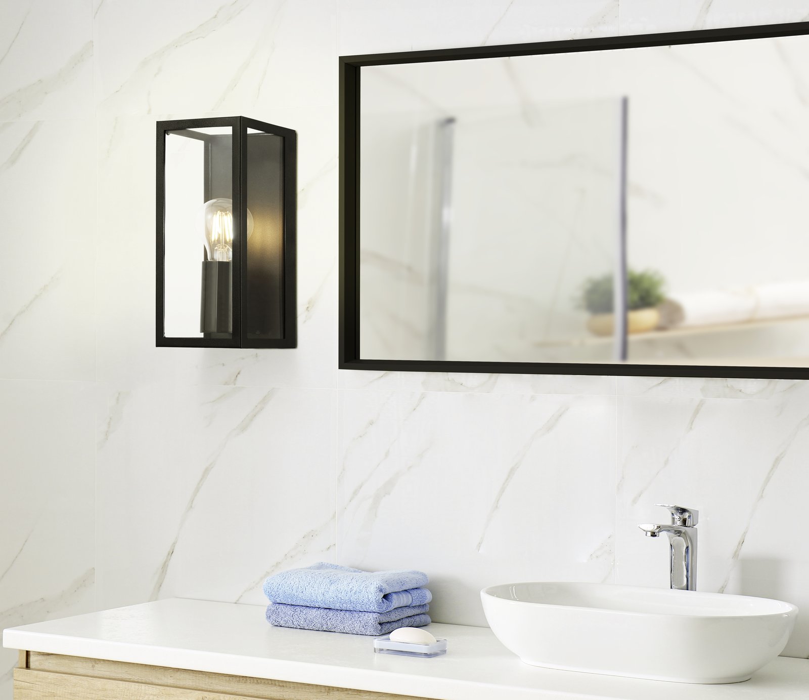 Sehr schöne, stilvolle Badezimmerleuchten aus schwarzem Stahl und klarem Glas. Sie können mit einem smarten LED-Leuchtmittel ausgestattet werden und so die Intensität und Farbtemperatur der Beleuchtung verändern. |