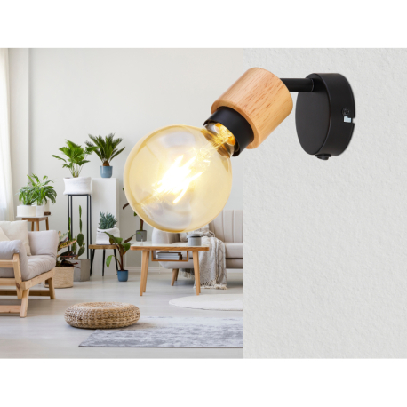 GL-54031-1 Nástěnné svítidlo, kov černý, světlé dřevo, vypínač, ?xV: 8x10cm, H:15cm, bez žárovky 1xE27, max. 40W 230V -