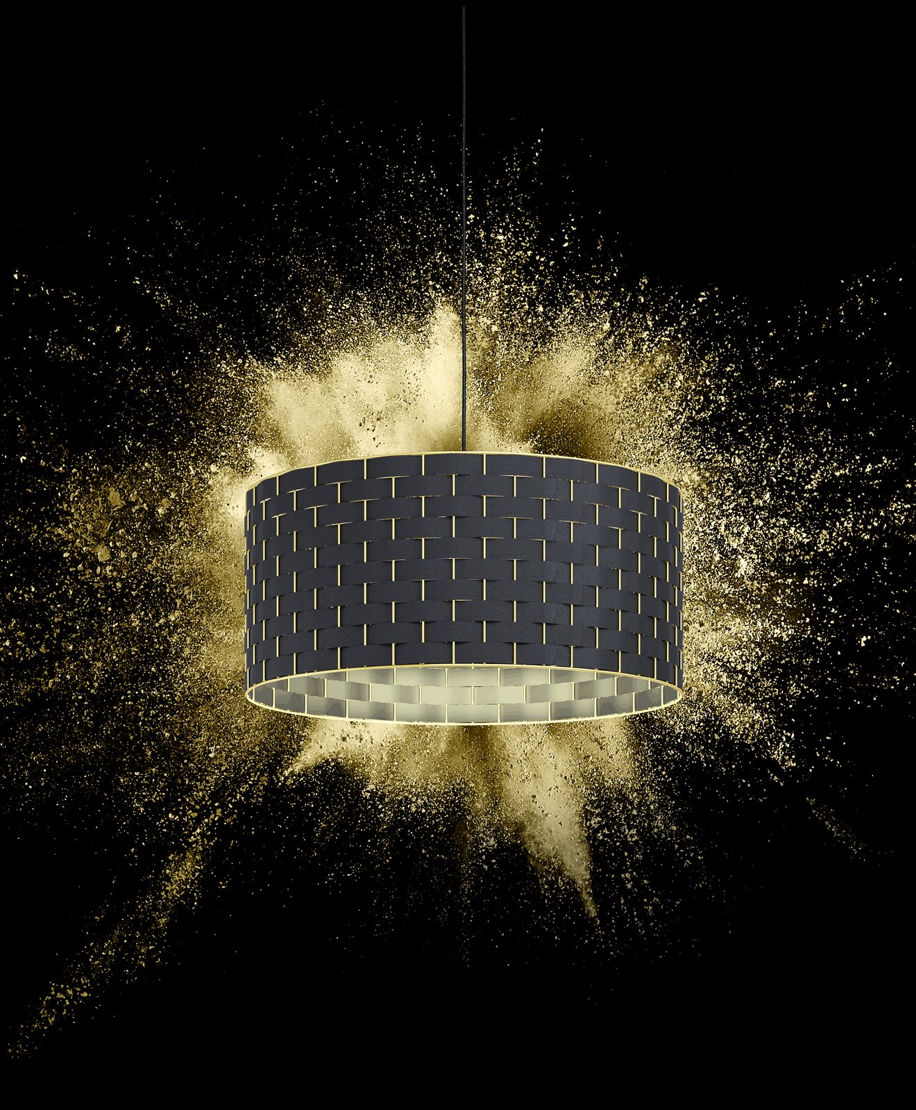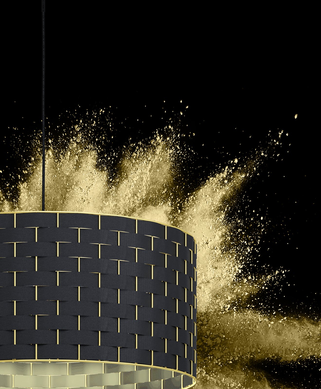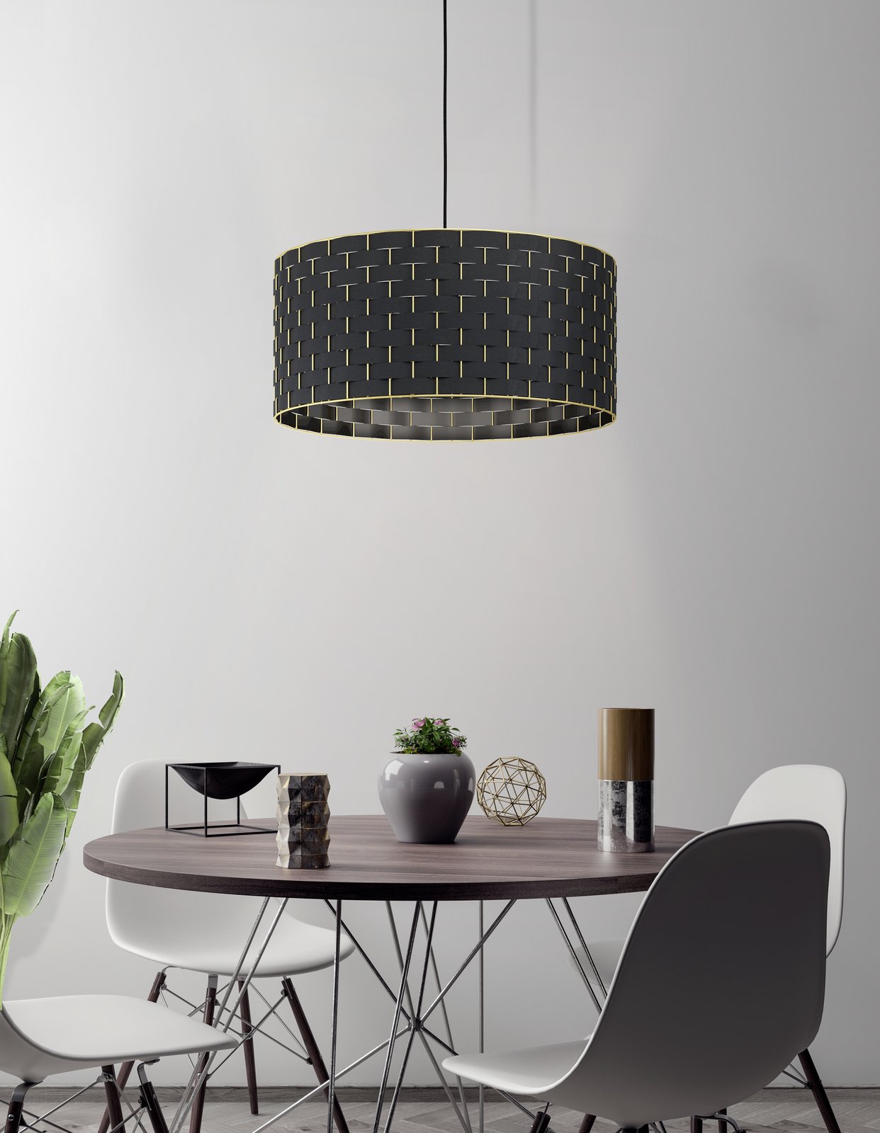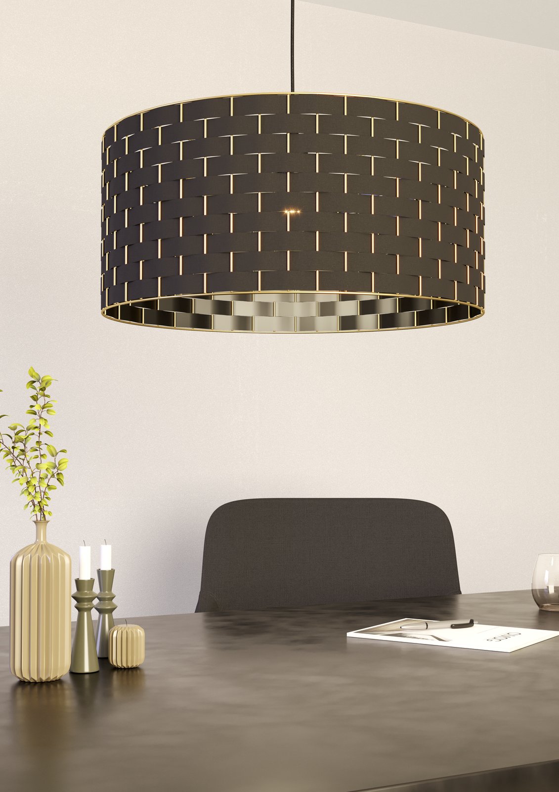 Moderne Lampen aus Stahl in Schwarz und Textil in Schwarz und Messing. Der Schirm der Leuchte besteht aus Textilgeflecht, was eine sehr effektvolle Wirkung hat. Es eignet sich für Wohnzimmer, Küchen und Esszimmer sowie Schlafzimmer, Flure usw. |