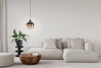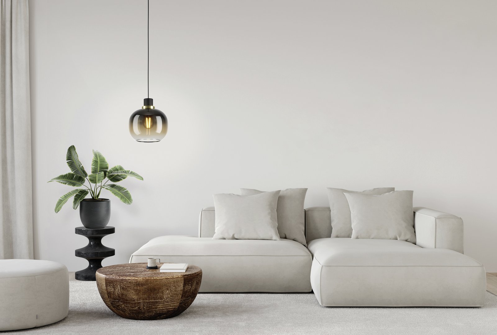 Nowoczesne lampy wiszące Oiella nadają się do kuchni i jadalni, ale także do salonów. Podstawa wykonana jest ze stali w kolorze czarnym i mosiądzu, a klosz ze szkła w kształcie kuli. |